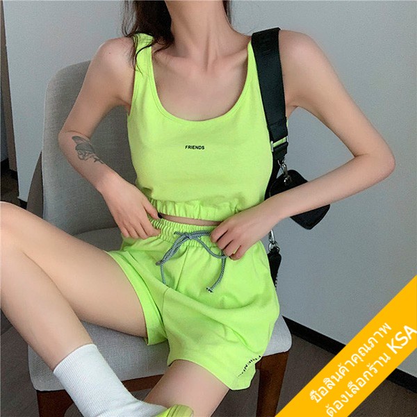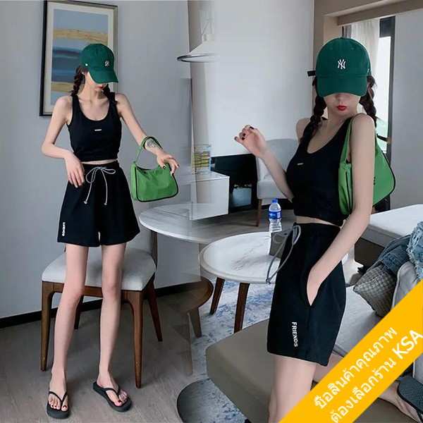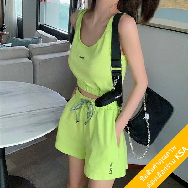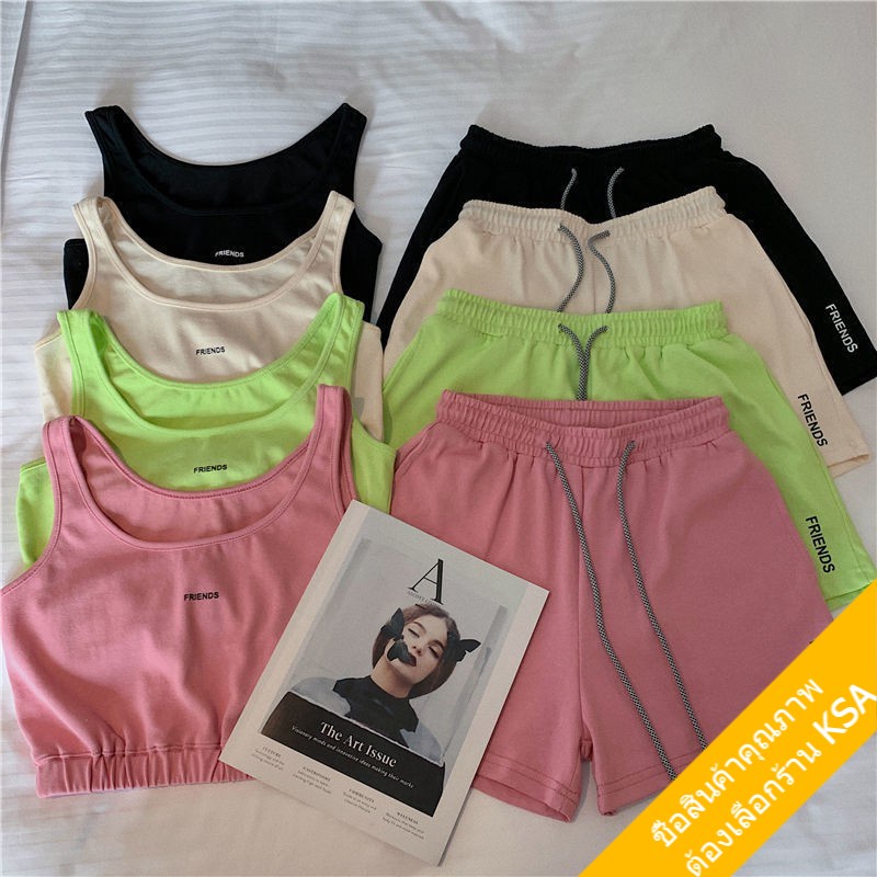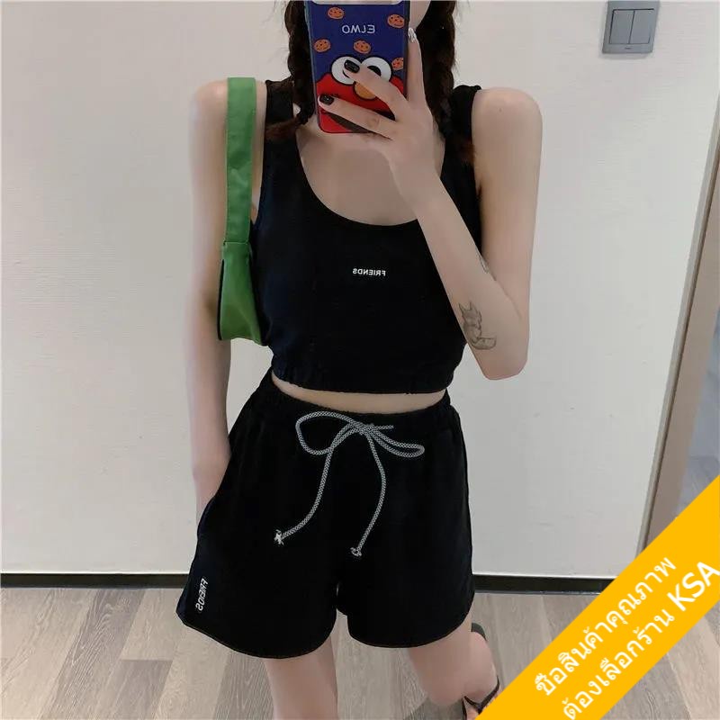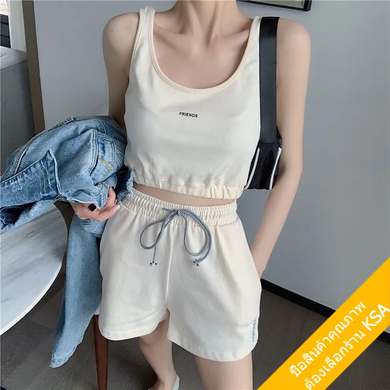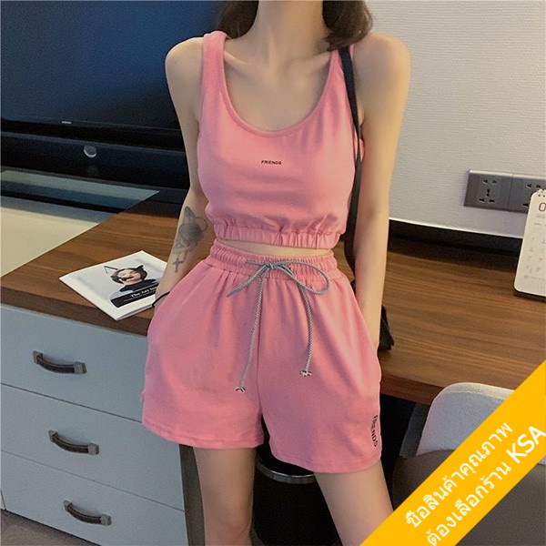 KSA ชุดเซ็ตเอวลอย เสื้อกล้ามครอป+กางเกงขาสั้นขากว้าง ชุดเซตเกาหลี 2 ชิ้น ชุดกีฬาผู้หญิง ชุดออกกําลังกายผู้หญิง ลายปัก
