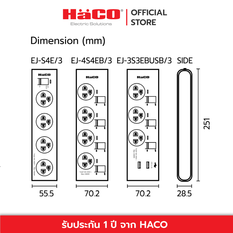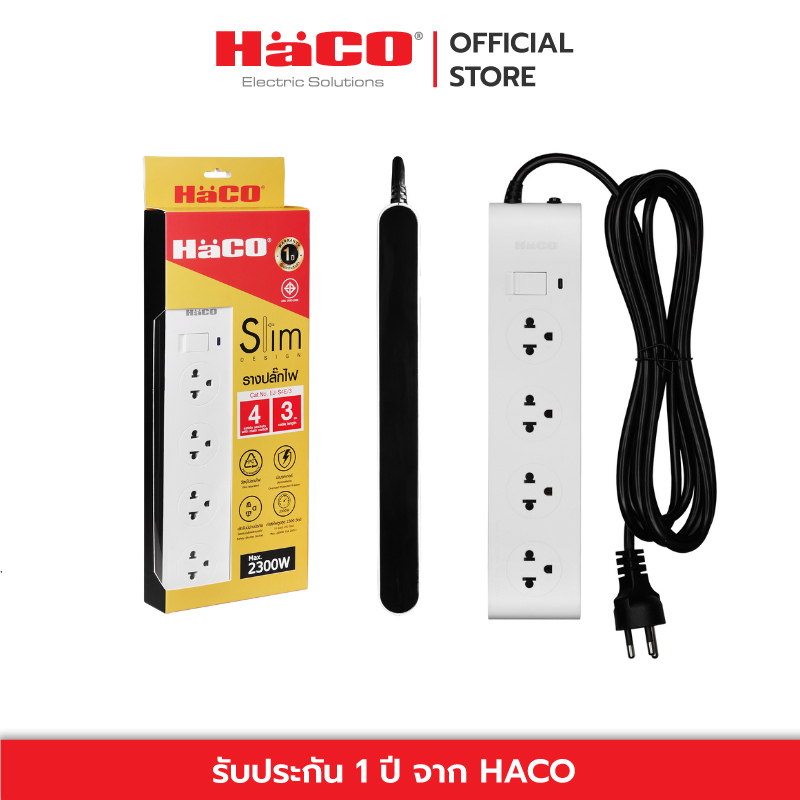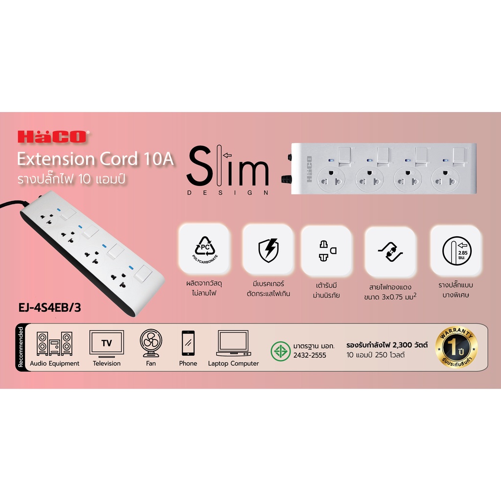 HACO รางปลั๊กไฟ 10 แอมป์ (250 โวลต์) เต้ารับ 4 ช่อง สวิตช์เดี่ยว สายไฟยาว 3 เมตร Slim Design รุ่น EJ-S4E/3