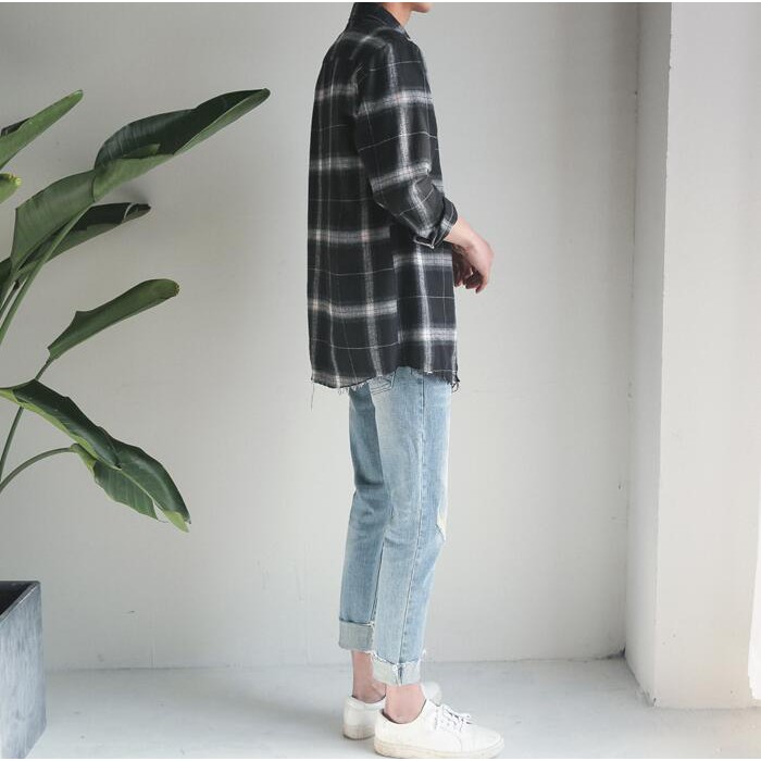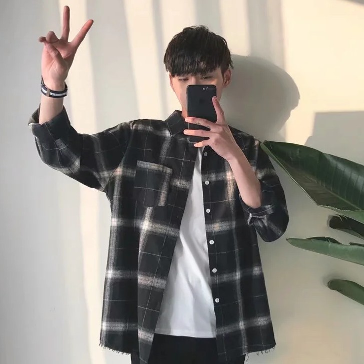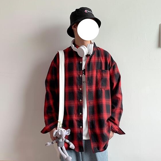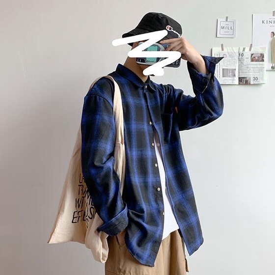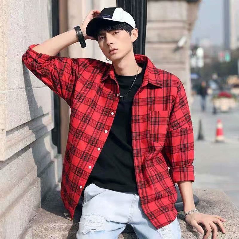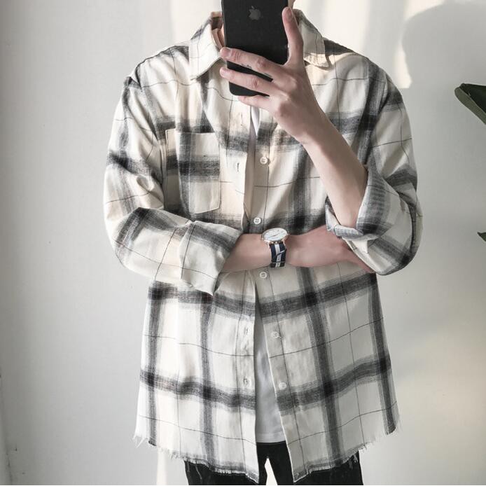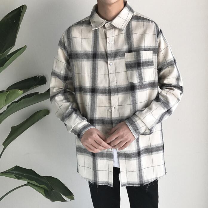 เสื้อเชิ้ตแขนยาว ลายสก๊อต ทรงหลวม สไตล์เกาหลี สำหรับผู้ชาย ไซซ์ M-3XL