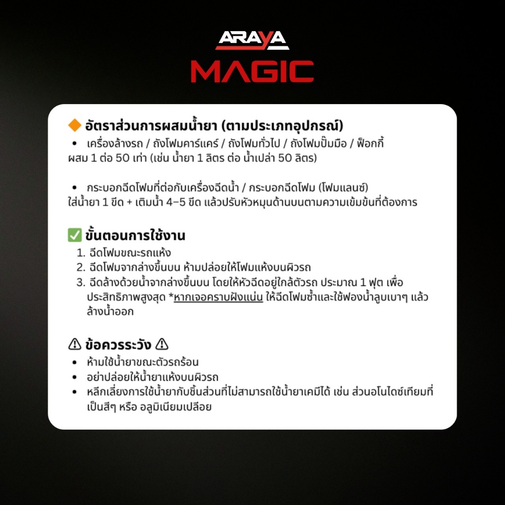 โฟมล้างรถไม่ต้องถู Magic (1 ลิตร) by ARAYA ผสม50เท่า🔥 ทำความสะอาดลึก ใช้กับรถเคลือบแก้วได้