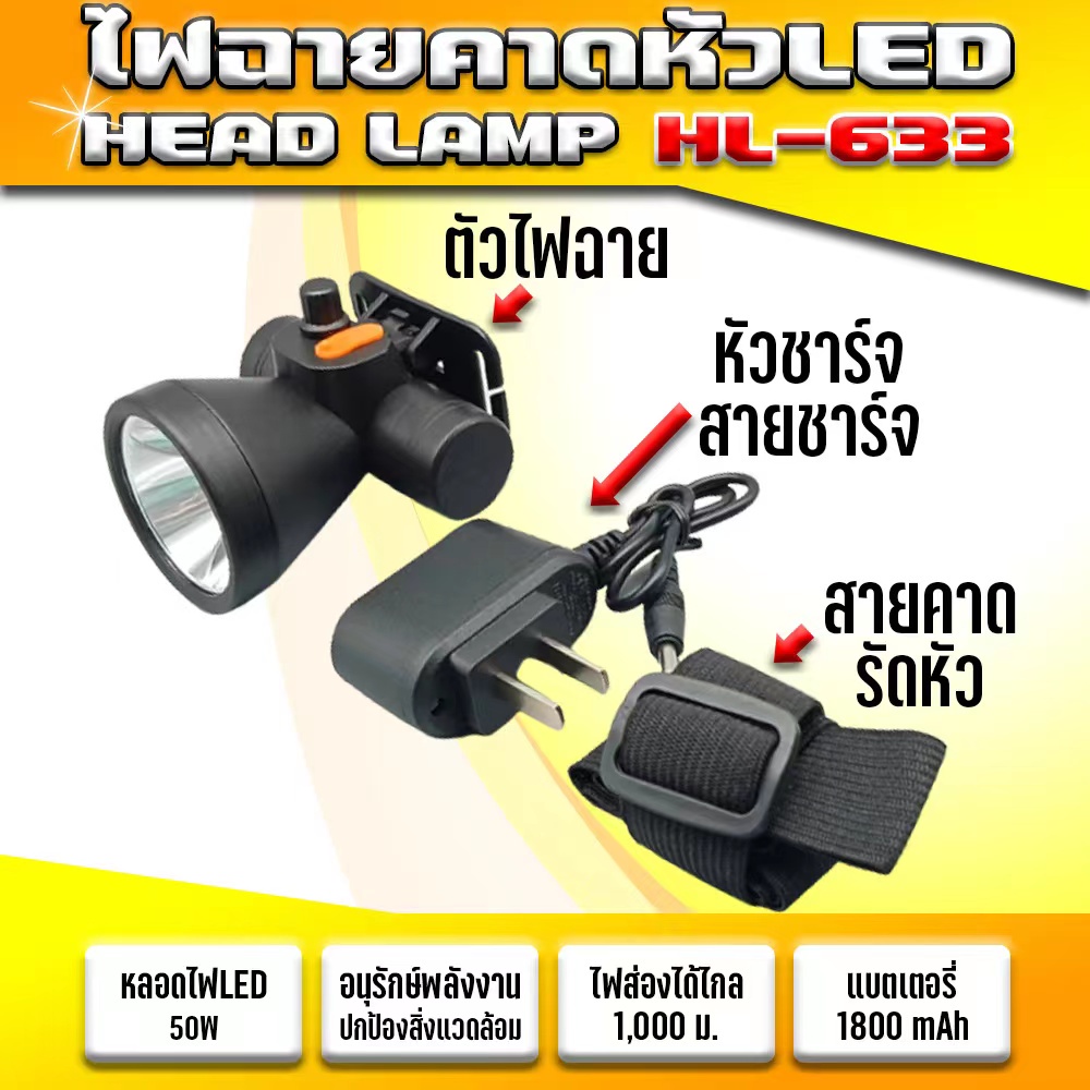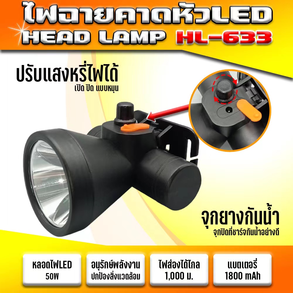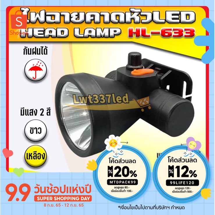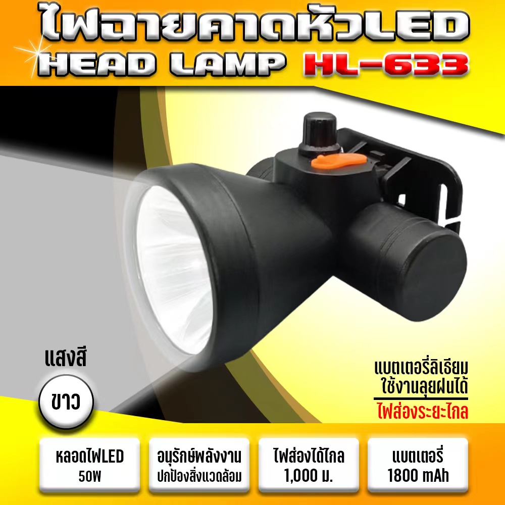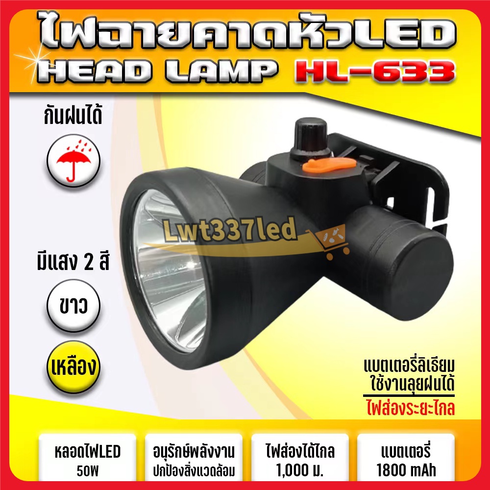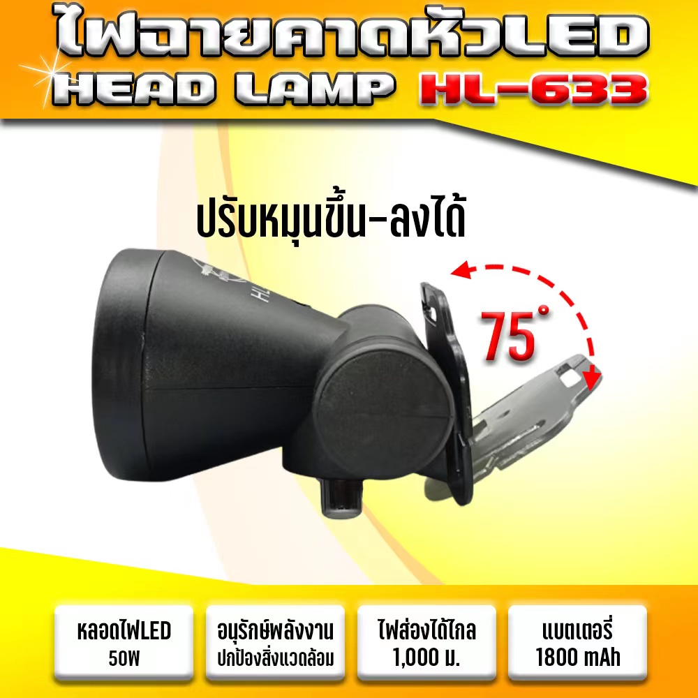 ไฟฉายคาดหัว ส่องกบ HL-633กันน้ำ แบตเตอรี่ลิเธียม ชาร์จไฟบ้าน แสงขาว/แสงเหลือง หม้อแบต Head torch LED
