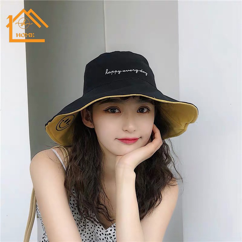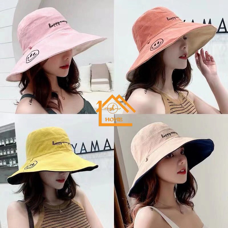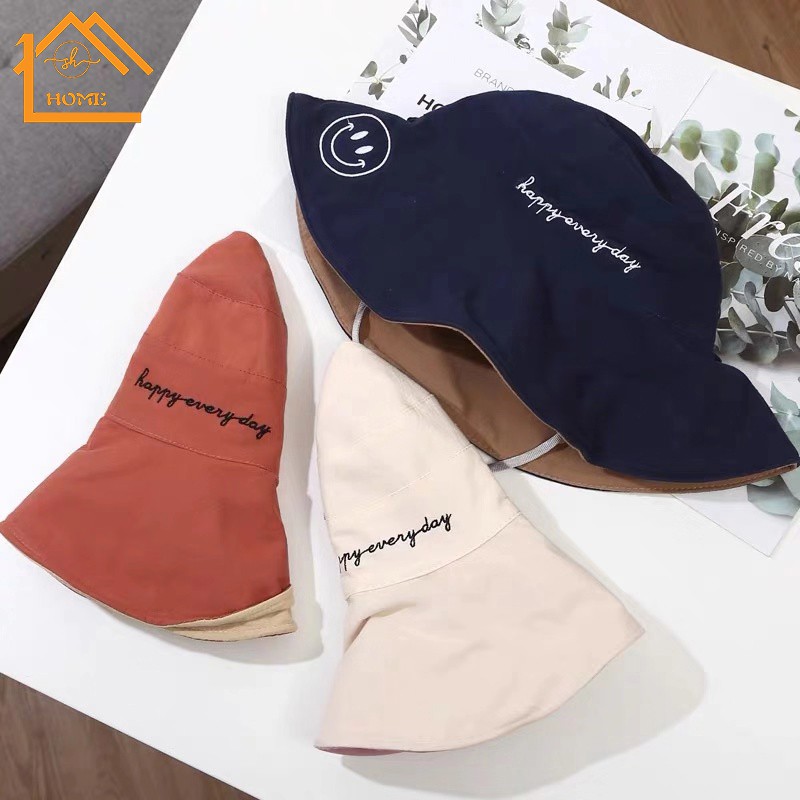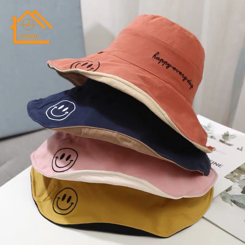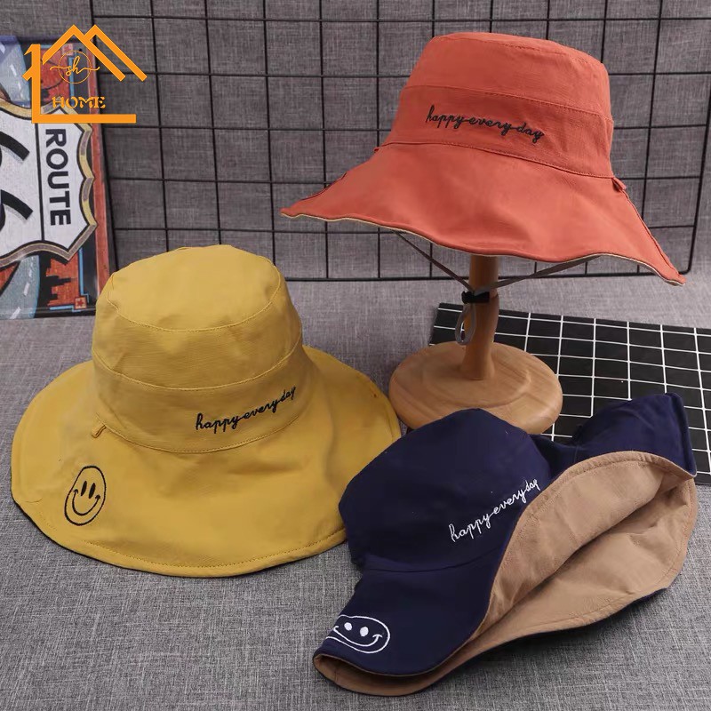 SH HOMEหมวกงานปักยิ้มผ้าแคนวาส หนาใส่ได้สองด้าน มีเชือก กันแดด ไม่ร้อน ใส่สบาย