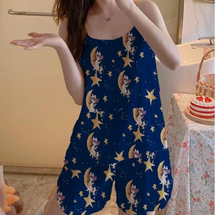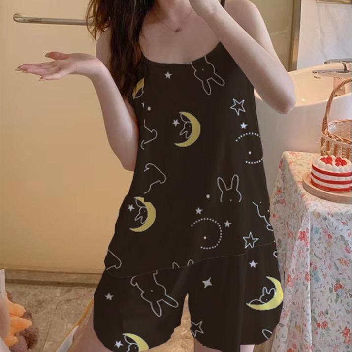 ชุดนอนมินิมอล2ชิ้น ผู้หญิง เสื้อ+กางเกง สายเดี่ยวลายน่ารักรหัส QB