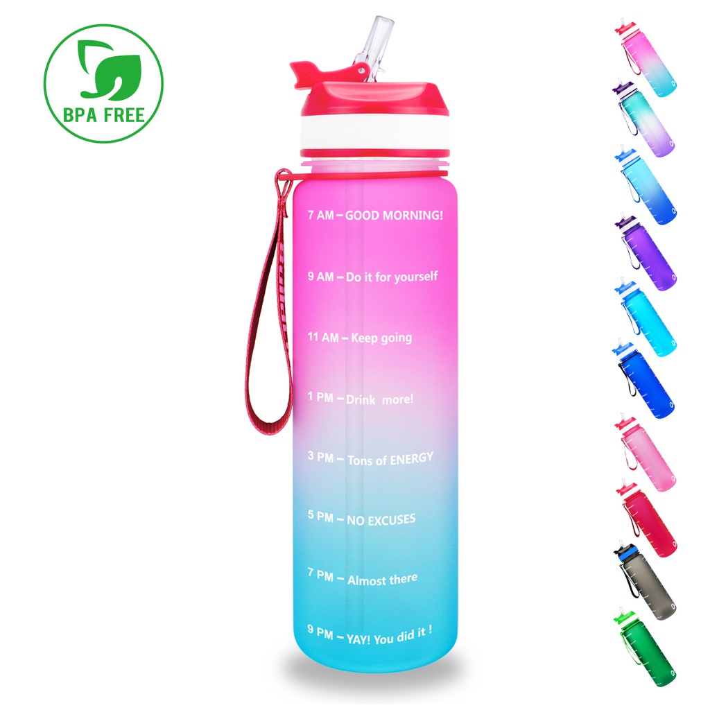 Quifit ขวดน้ํา 1 ลิตร ไม่มีฟาง พร้อมหลอด ไร้ BPA แรงจูงใจเวลา มาร์กเกอร์ แคมป์ปิ้ง โบตอล สําหรับกีฬา และการออกกําลังกาย