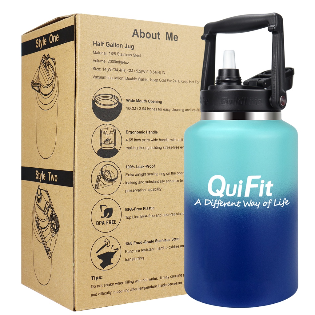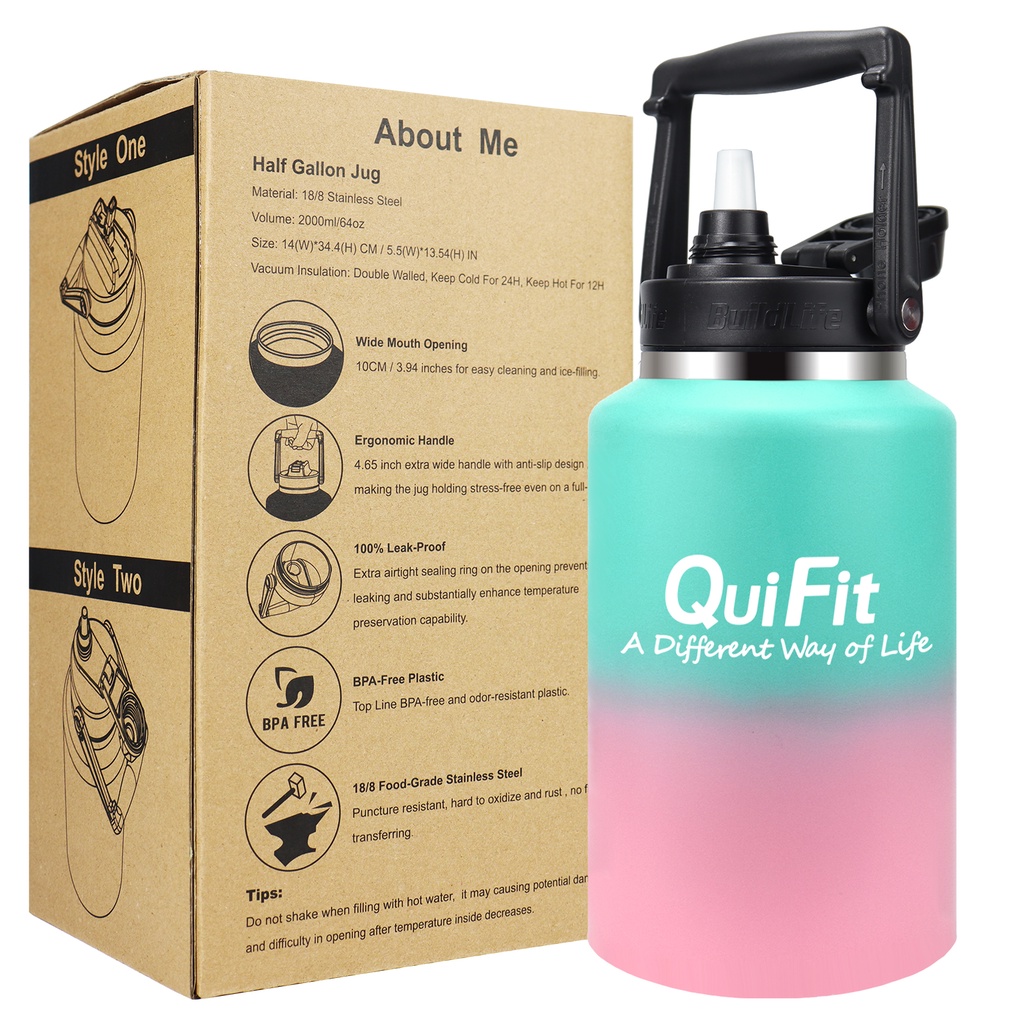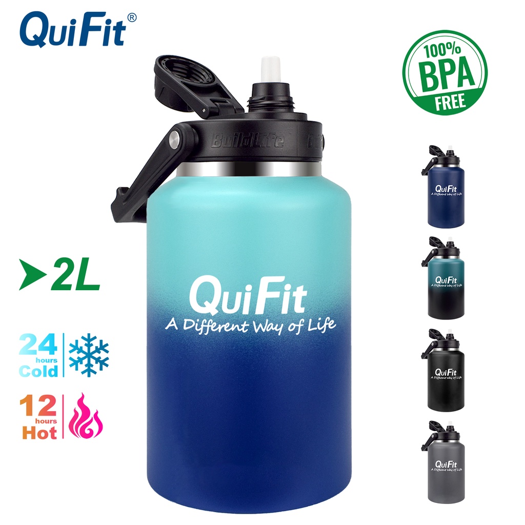 Quifit ขวดน้ําสเตนเลส ปากกว้าง 2 ลิตร และ 3.8 ลิตร พร้อมหลอดดูด กันรั่วซึม ใช้ซ้ําได้ สําหรับเดินทาง