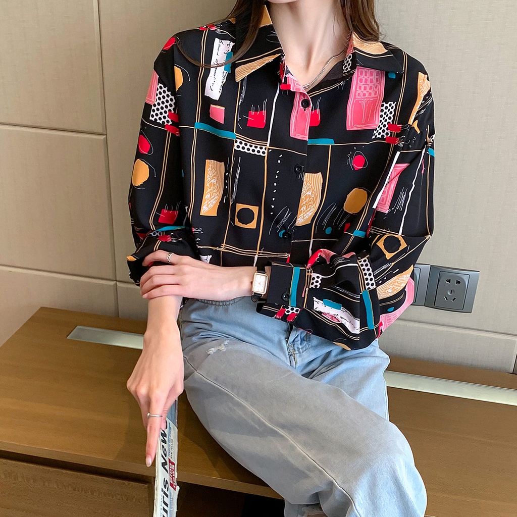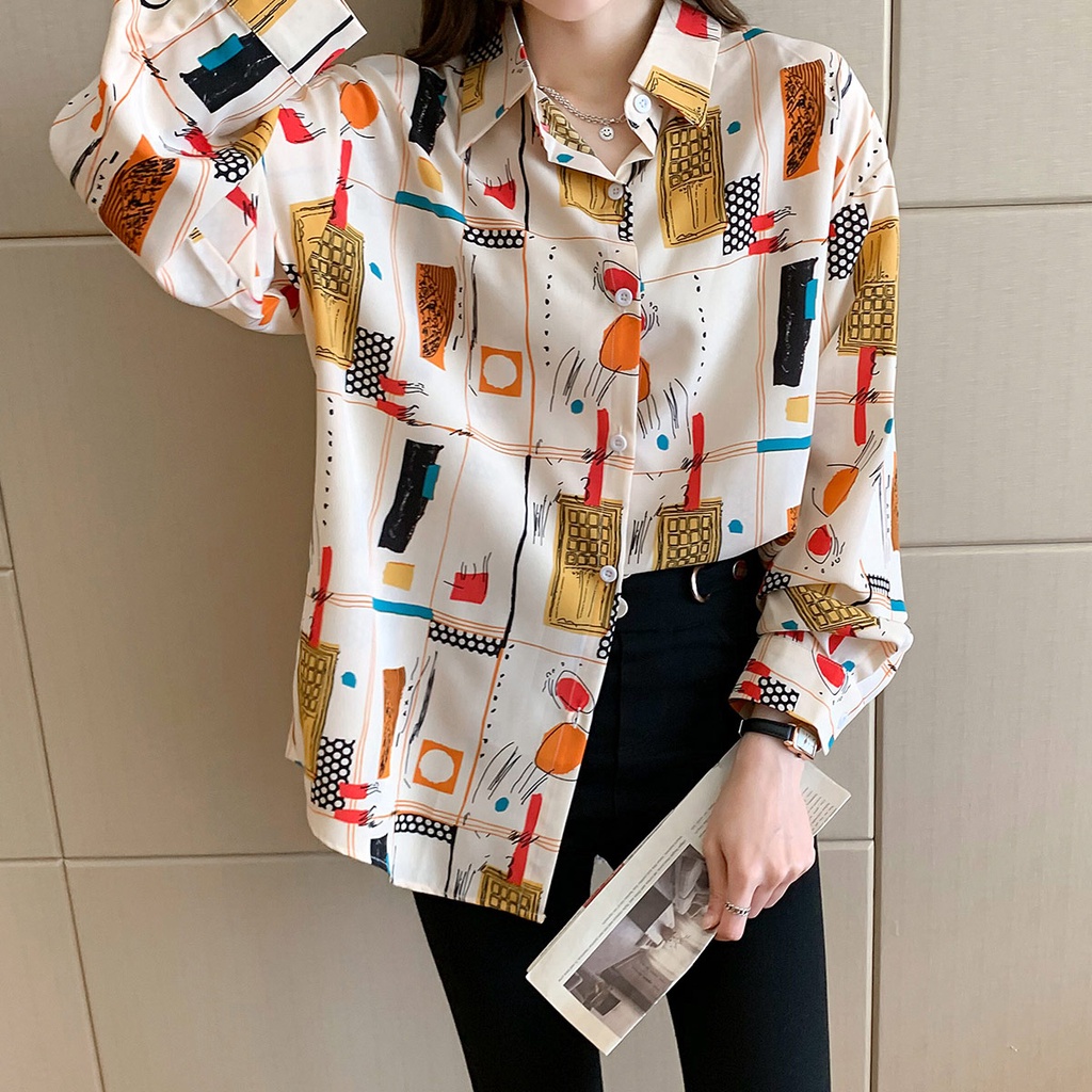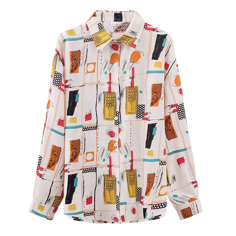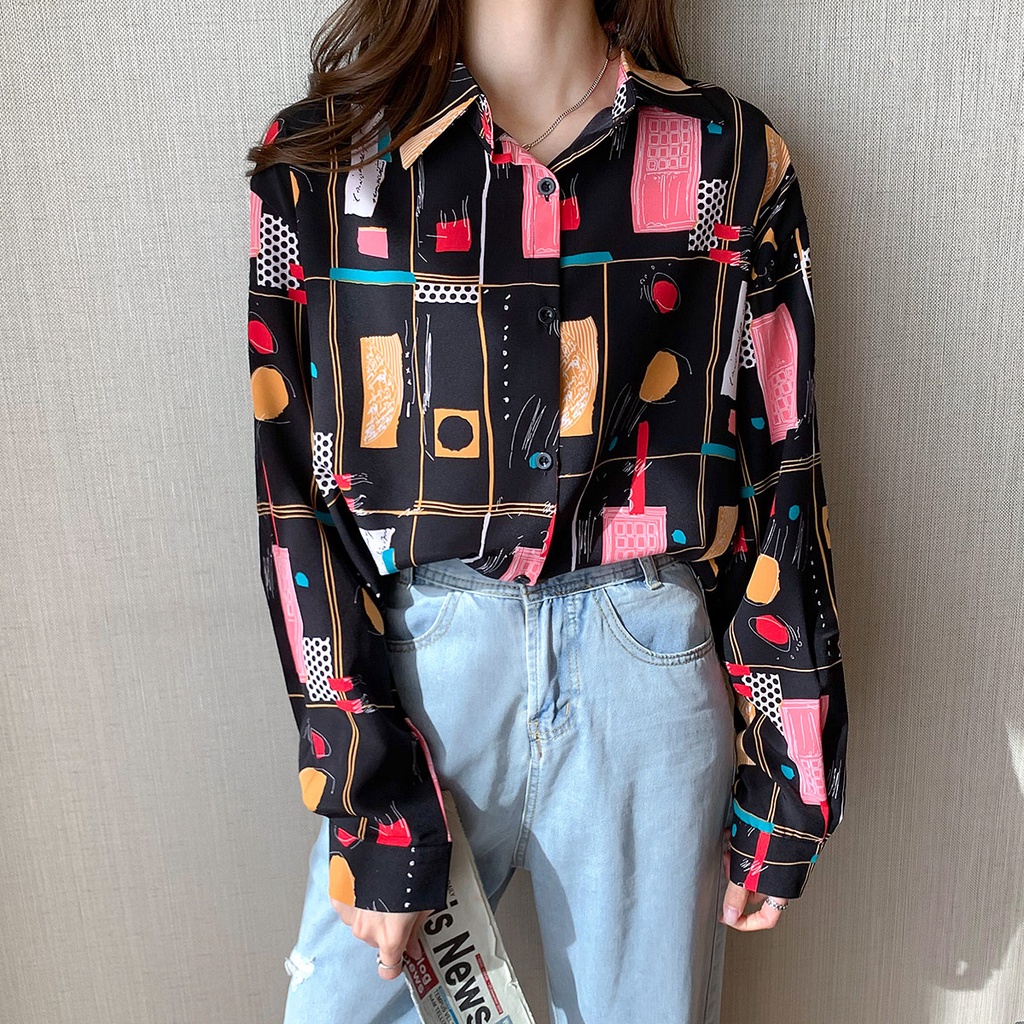 เสื้อเชิ้ตผู้หญิง สีดำ สีครีม อก 38 40 42 44 46 มีขนาดสาวอวบ สไตล์แฟชั่นเกาหลี ลายกราฟฟิก