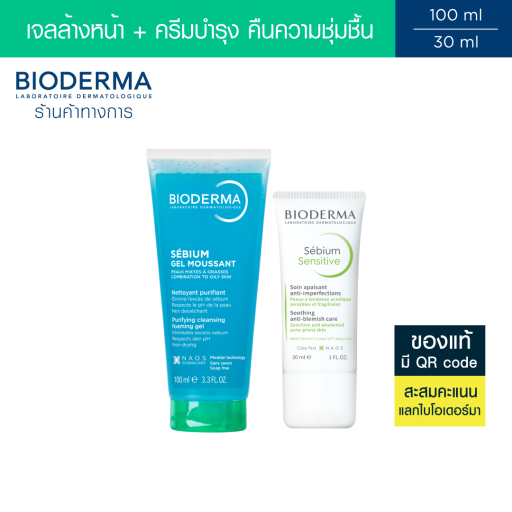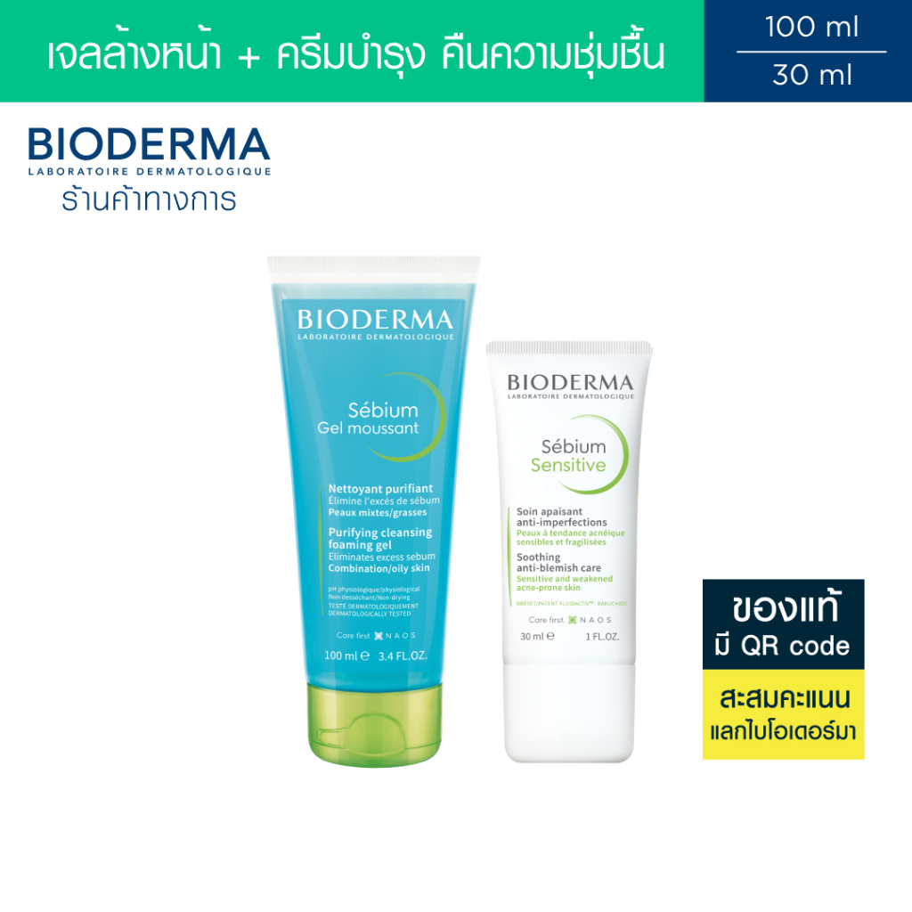 Bioderma Sebium Gel Moussant 100 ml + Sebium Sensitive 30 ml เจลล้างหน้าและครีมสำหรับผิวมัน เป็นสิวง่าย