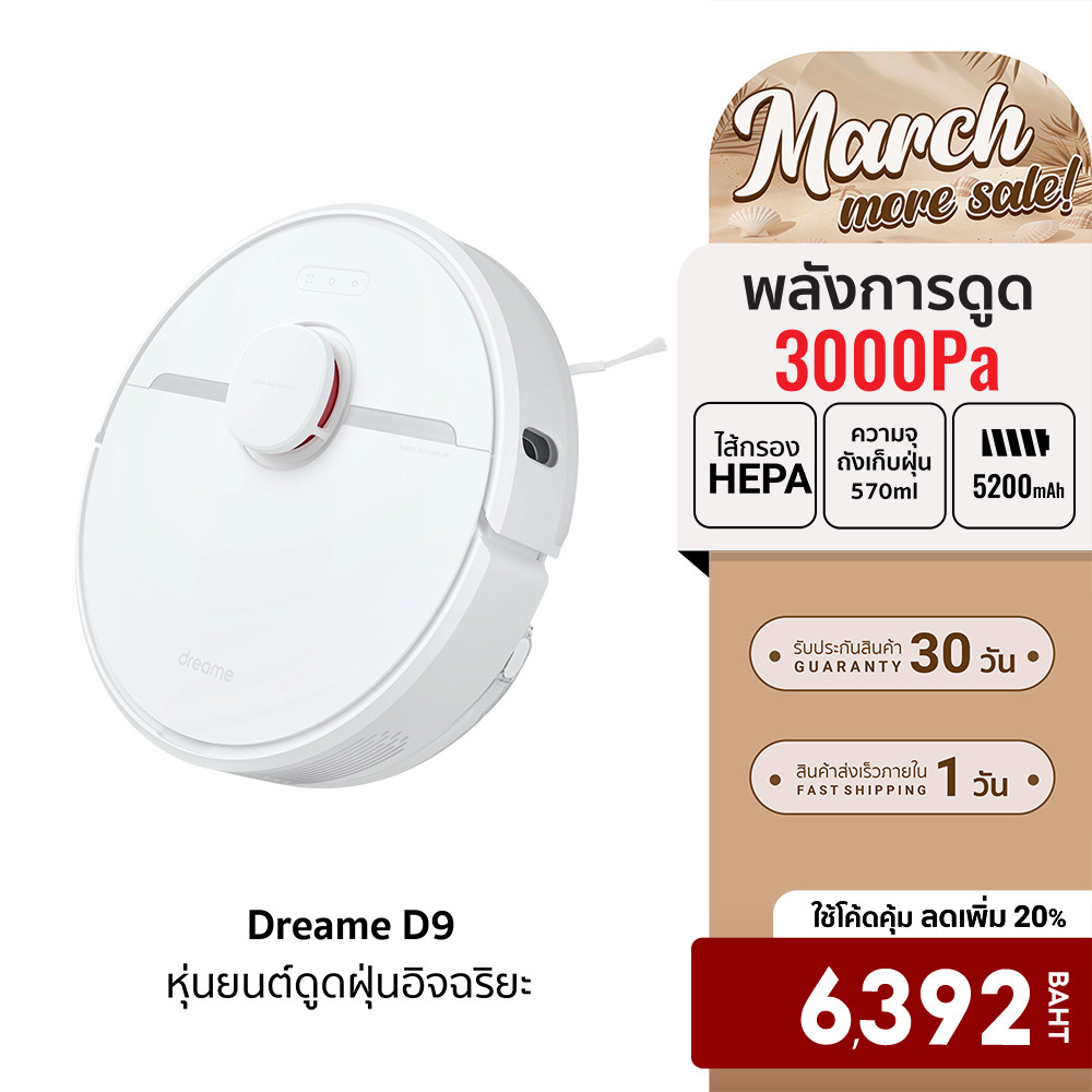 [ลดเหลือ 6392] Dreame D9 หุ่นยนต์ดูดฝุ่นอิจฉริยะ พลังการดูด 3,000Pa สามารถดูดฝุ่นได้หมดจด -30D
