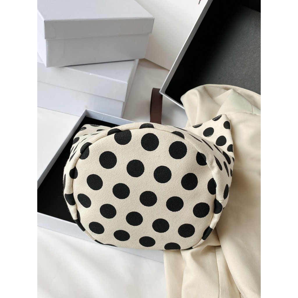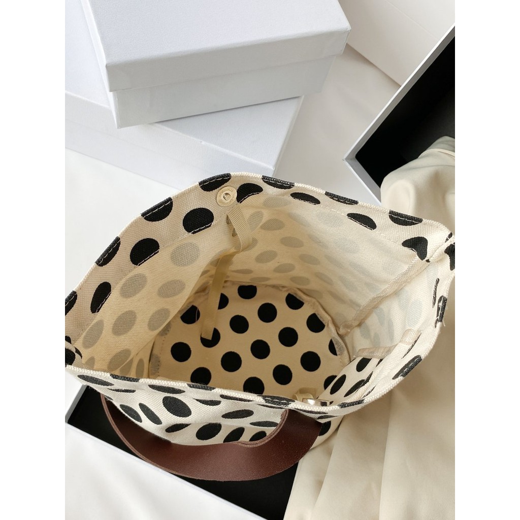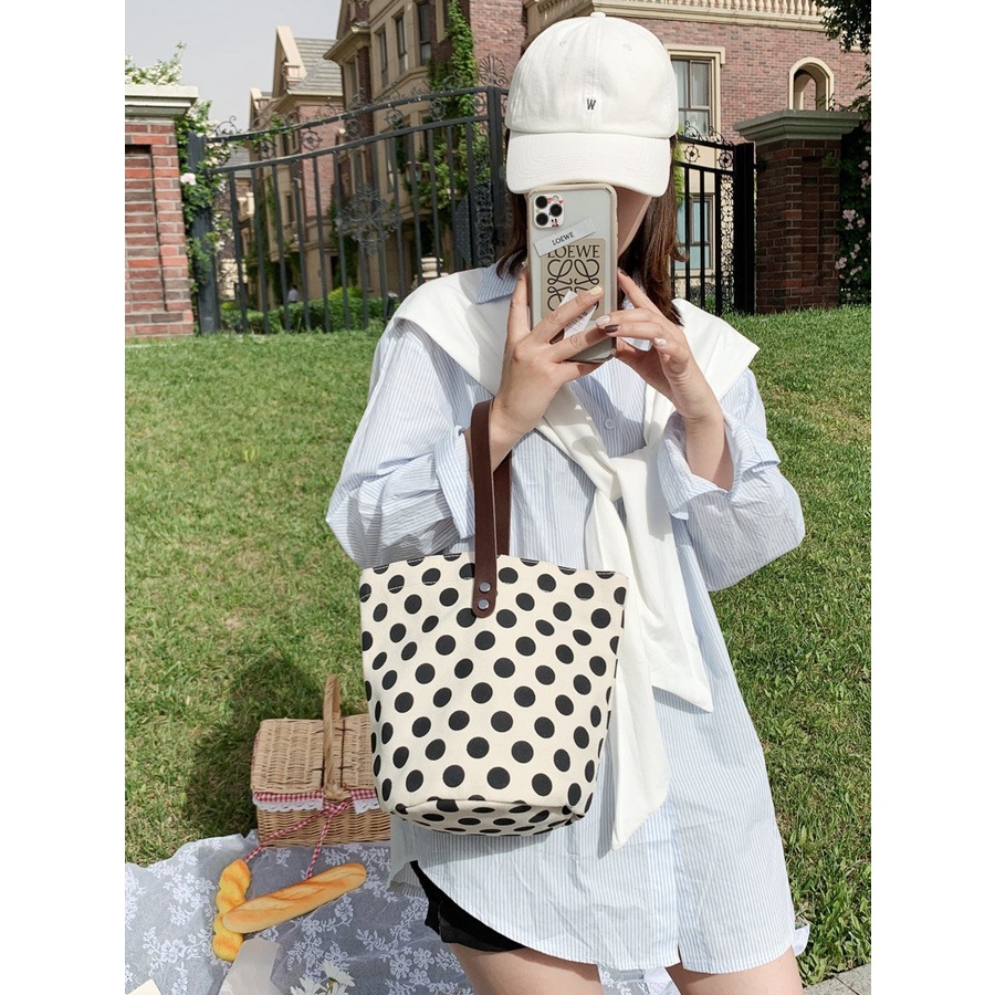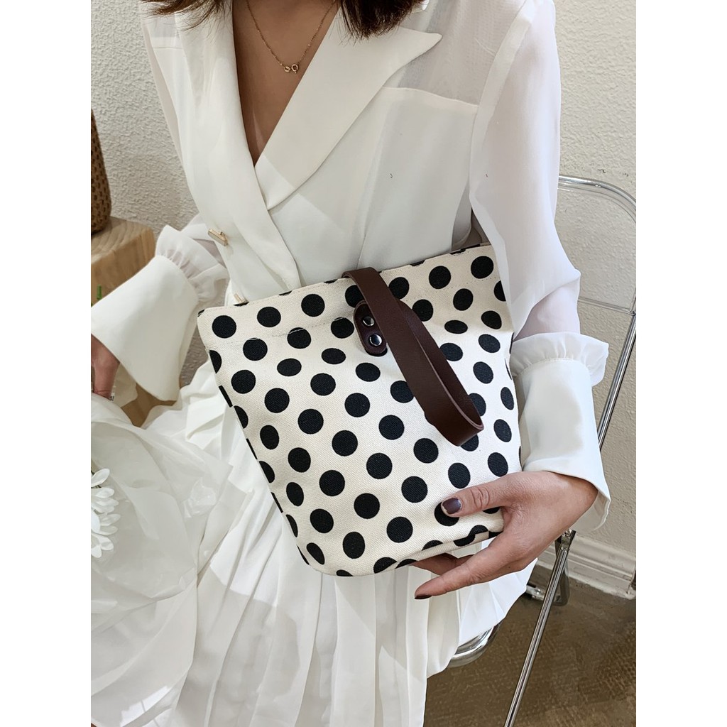 [CODE 22BAGSUP, CODE SPC212BAG] กระเป๋าคล้องแขน ผ้าฝ้ายพิมพ์ลายจุด สายหนัง