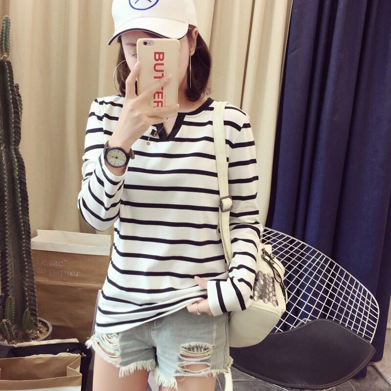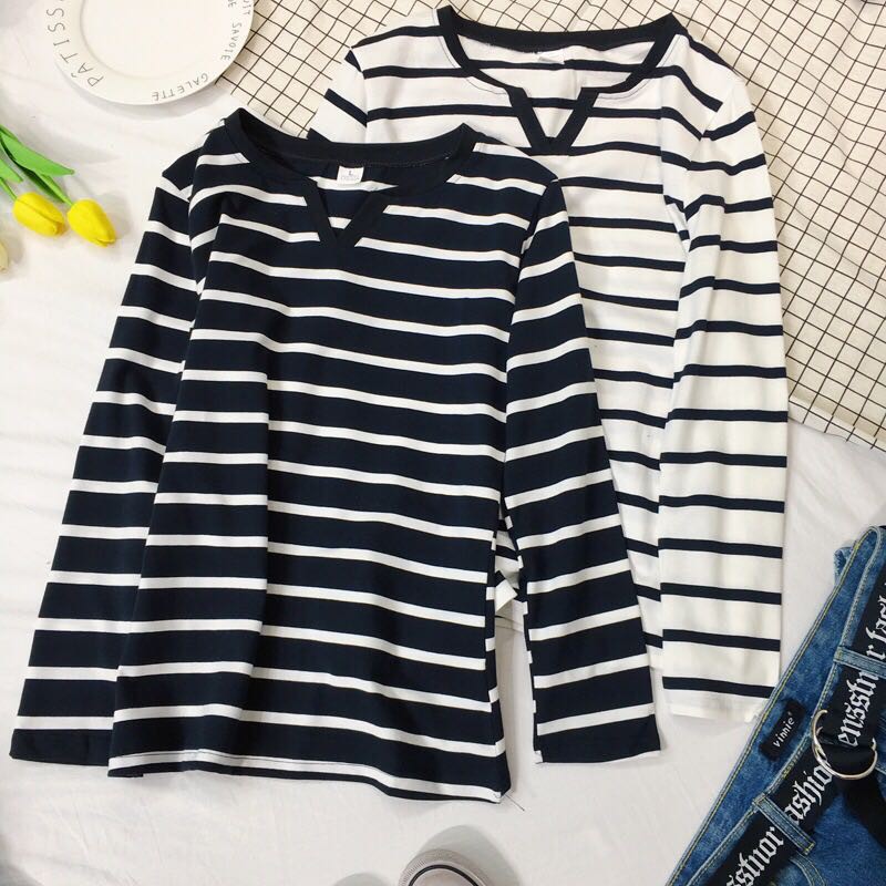 เสื้อยืดผู้หญิง คอวีแขนยาว ลายขวาง ผ้านิ่มใส่สบาย
