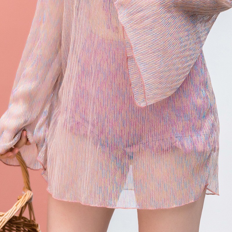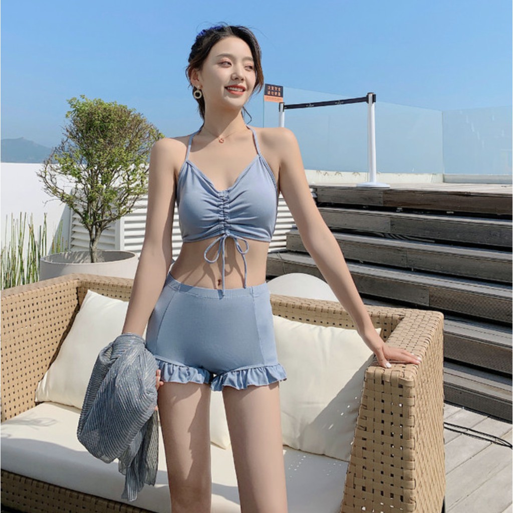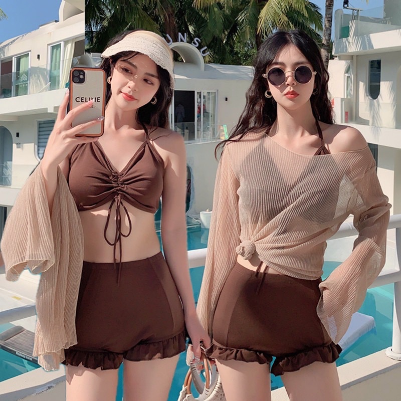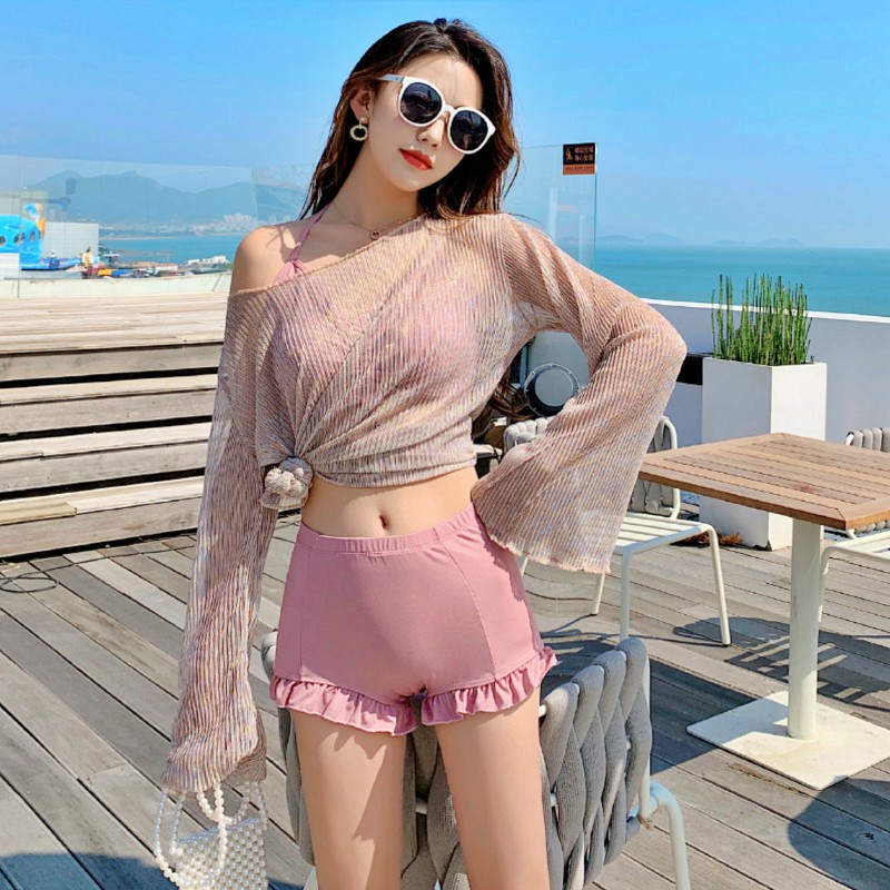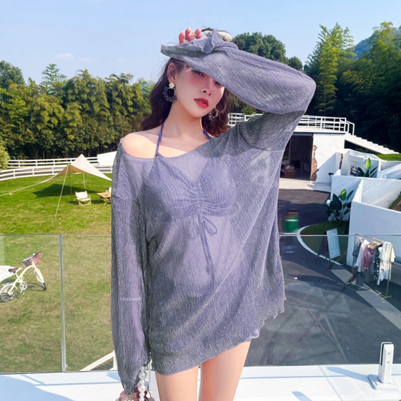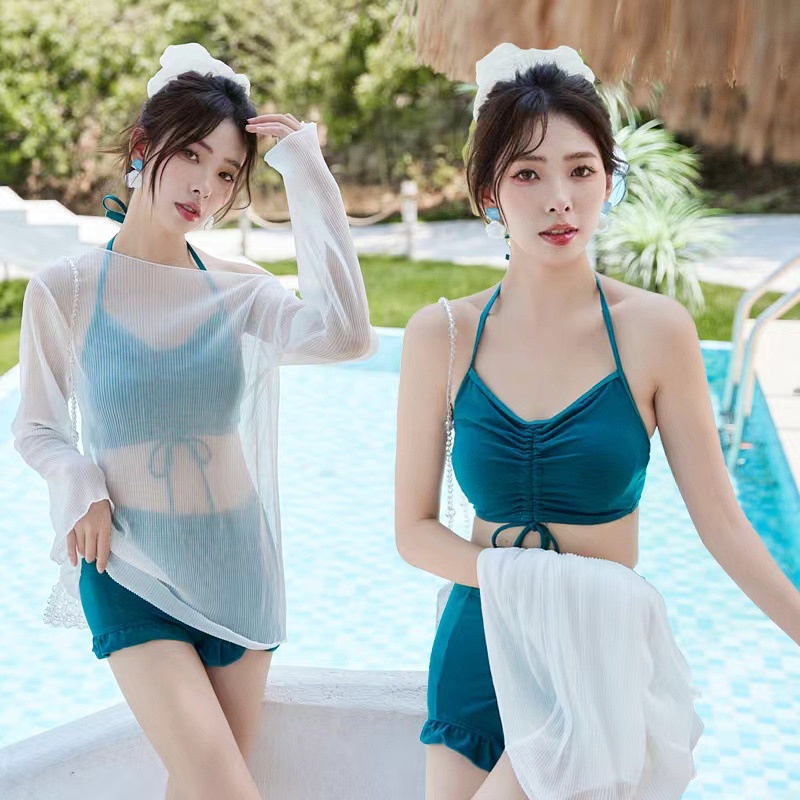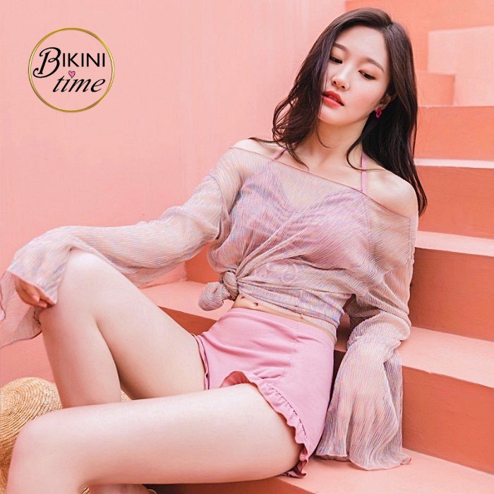🏖BikiniTime มี 10 สี SB112 ชุดว่ายน้ำบิกินี ฟรีไซส์ ผ้าบาง เซ็ท3ชิ้น พร้อมเสื้อคลุมแขนยาวซีทรู บรามีฟองน้ำเสริม