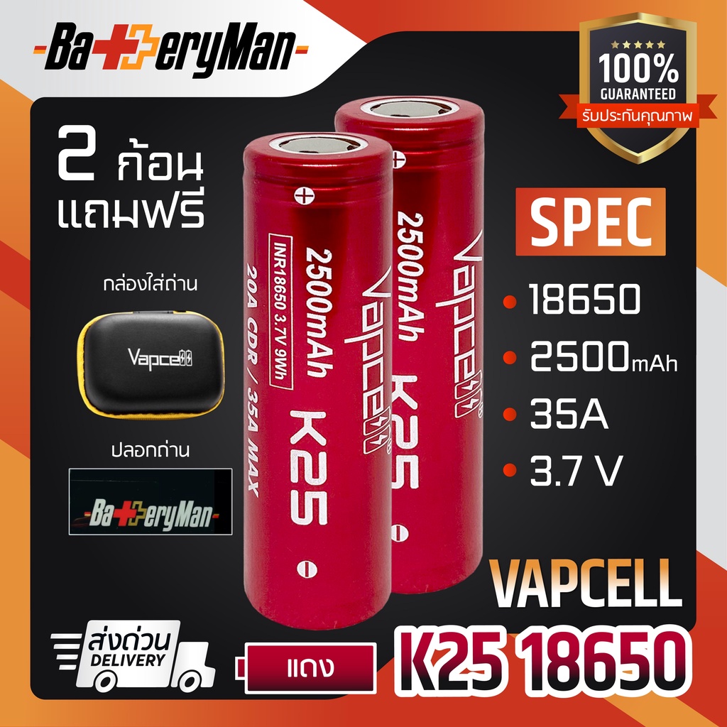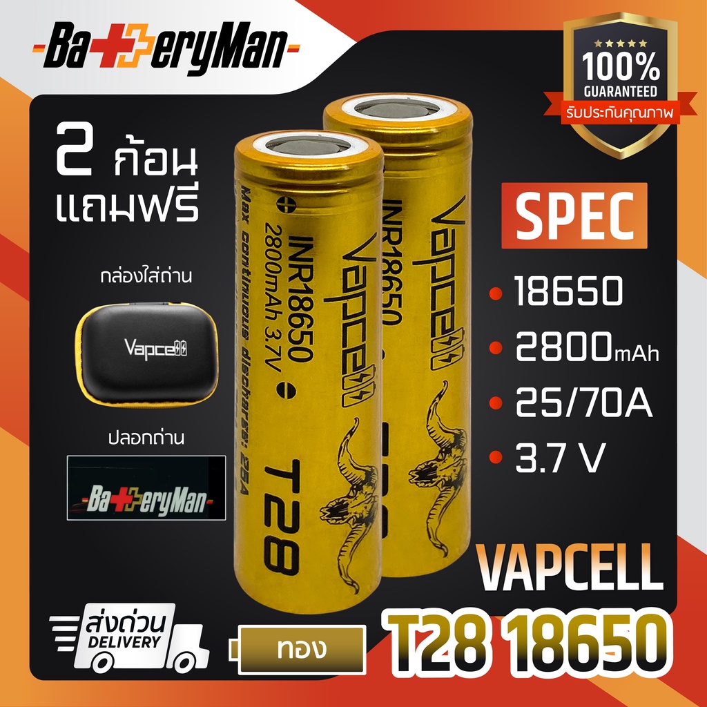 (มี มอก.)(เเท้100%)(2ก้อน) ถ่านชาร์จ Vapcell 18650 ขายดีที่สุดของร้าน (แถมกระเป๋า) (ร้านbatteryman)