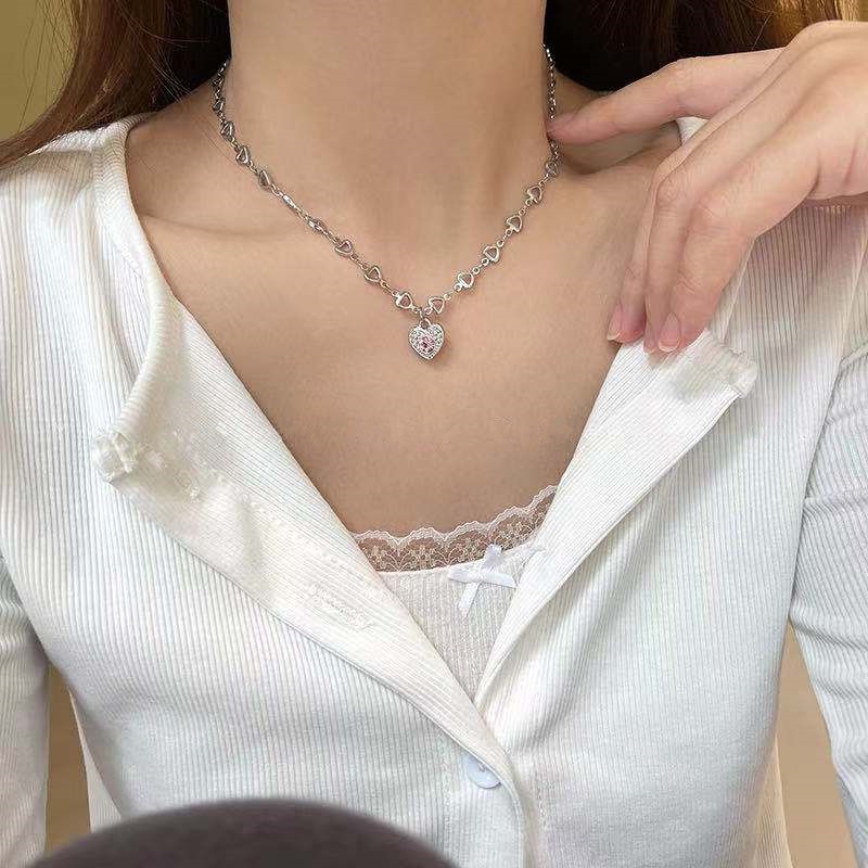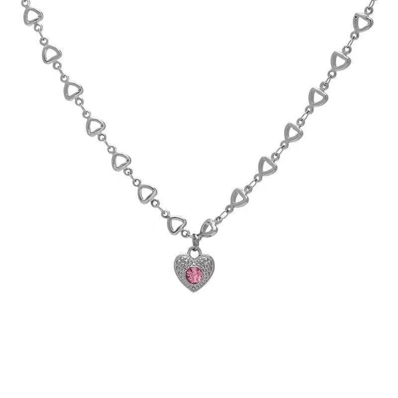 จี้สร้อยคอโซ่เหล็กไทเทเนียมรูปหัวใจสีชมพูออกแบบสไตล์ฤดูร้อน