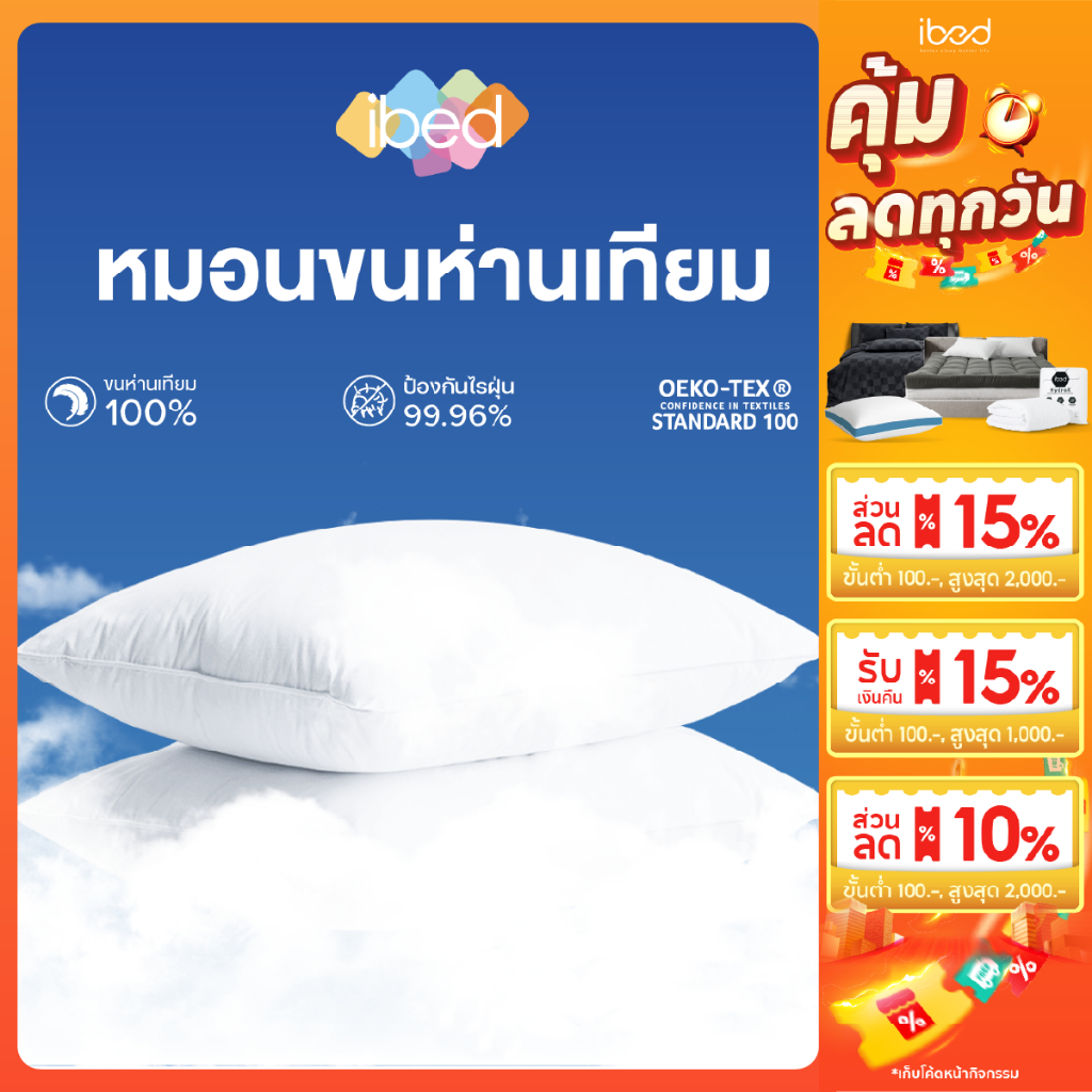 ibed หมอนขนห่านเทียม กันไรฝุ่นมีใบรับรองป้องกันไรฝุ่น หมอนหนุน นุ่มพิเศษ นุ่มฟูคืนตัว
