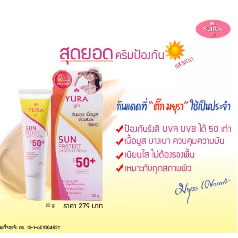 Yura Sun Protect Smooth ยูร่า ซัน โพรเทค สมูท ครีมกันแดด SPF50+ PA+++ 20g.