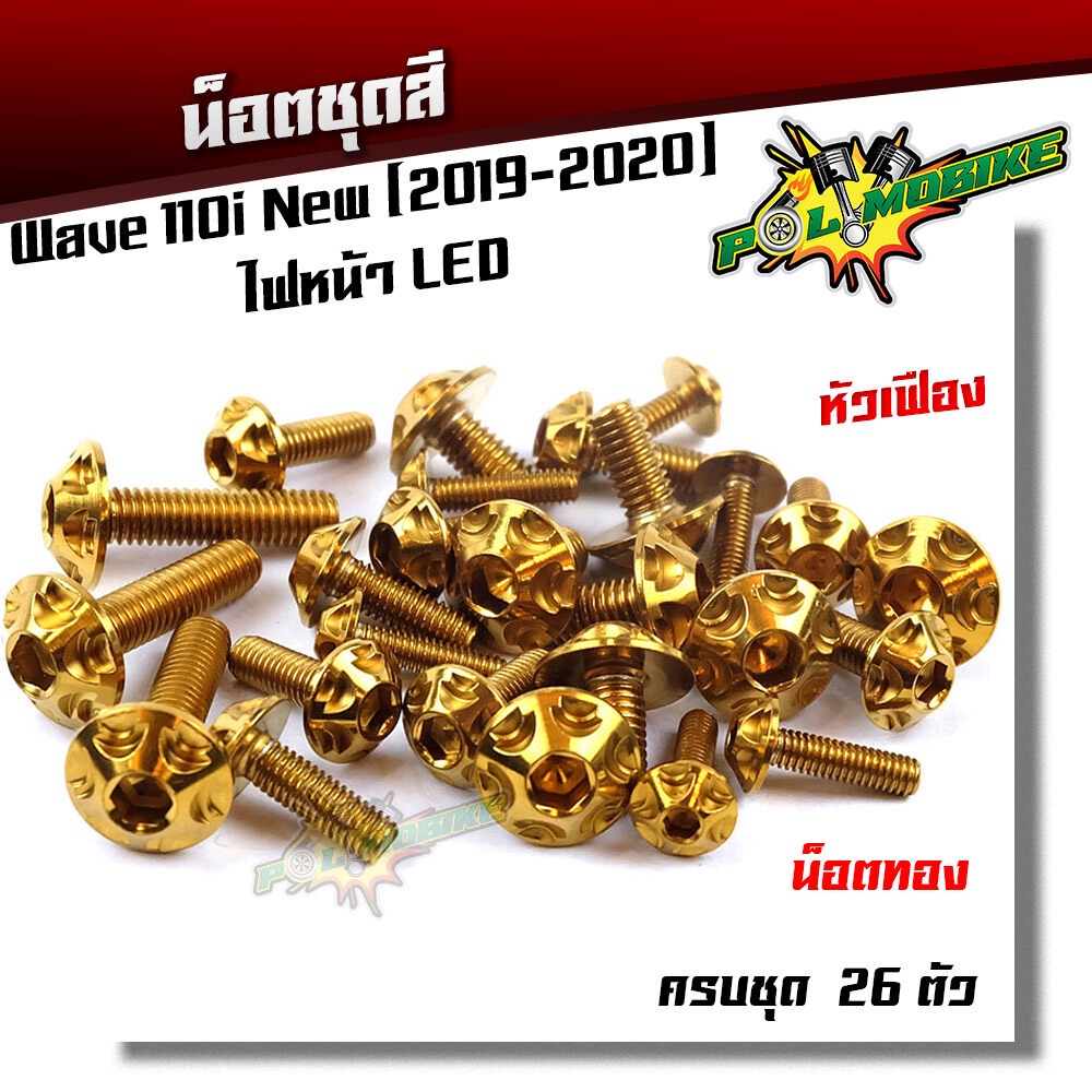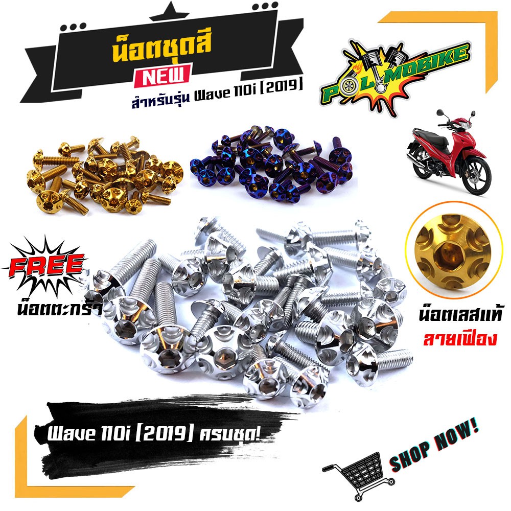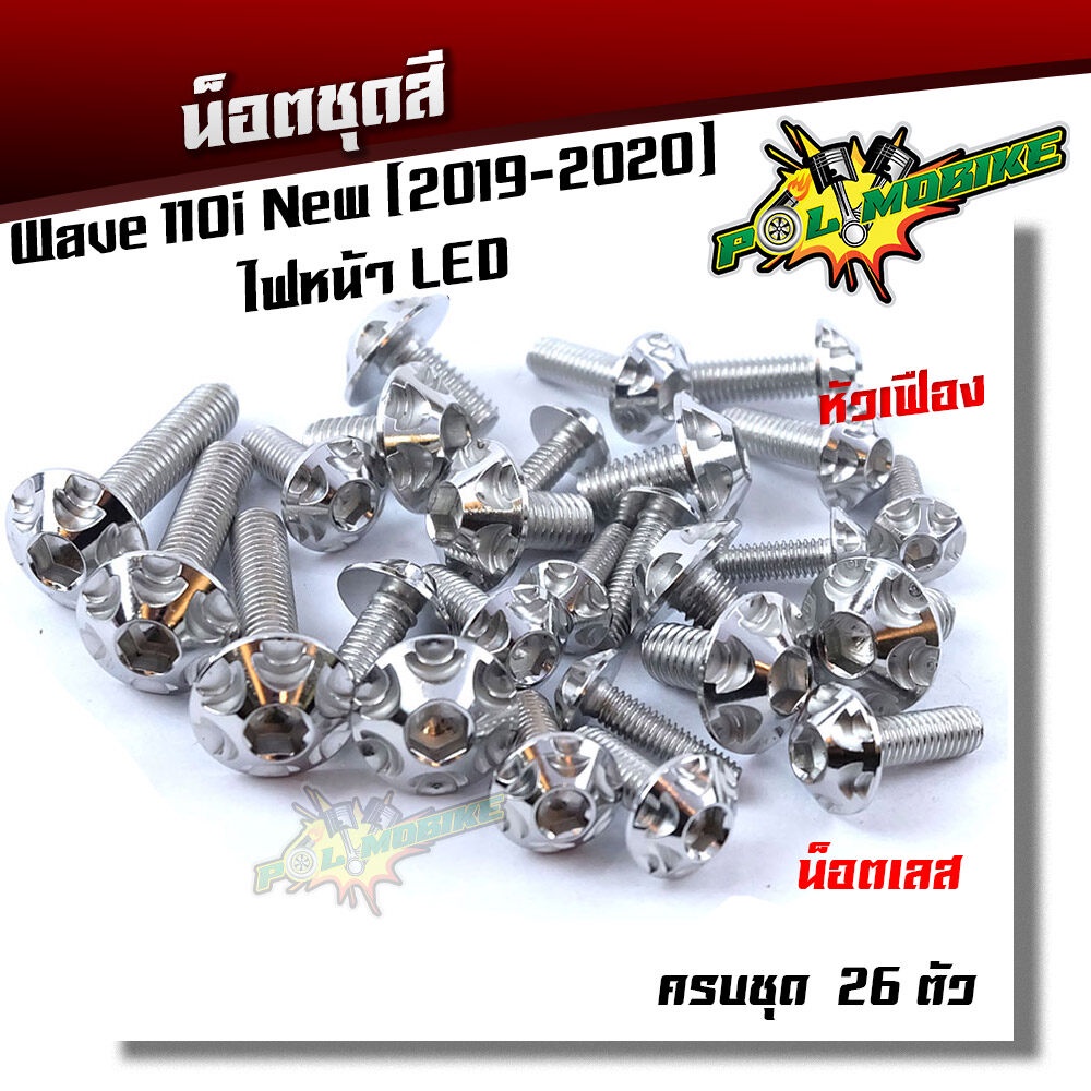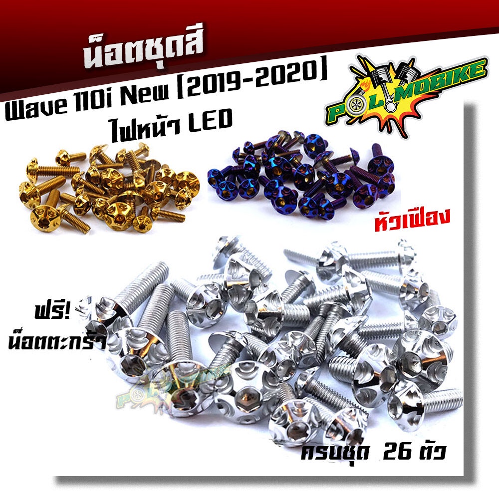 (ส่งฟรี) น็อตชุดสี เวฟ110i (2019-2023) ไฟหน้า LED หัวเฟือง ++แถมน็อตตะกร้า (ครบชุดมี 26ตัว)เลสแท้100