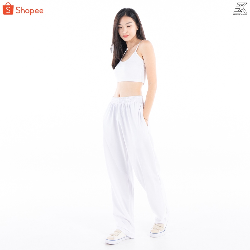 Expogarment กางเกงขายาว กางเกงขาปล่อย ผ้าปิเก้ มีกระเป๋า 2 ข้าง เอวยางยืด ฟรีไซส์ เอวสูง สาวมีโพกใส่ได้ ไม่เต่อไม่ลอย