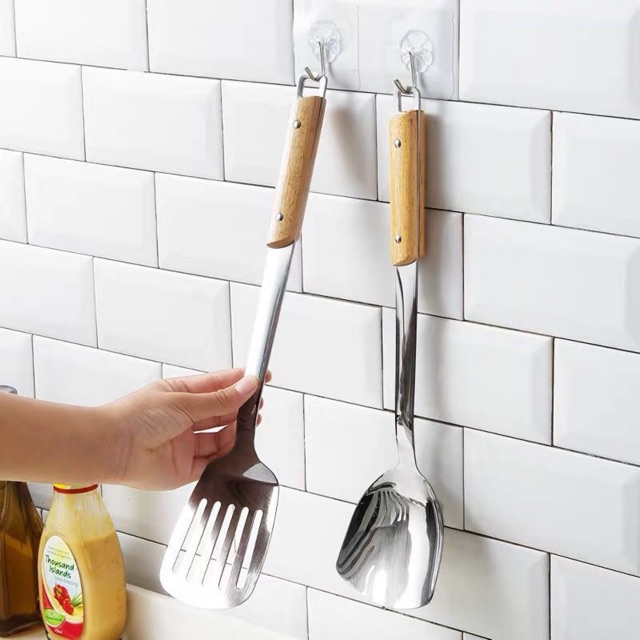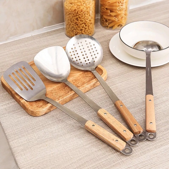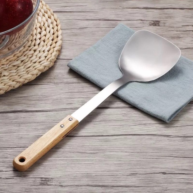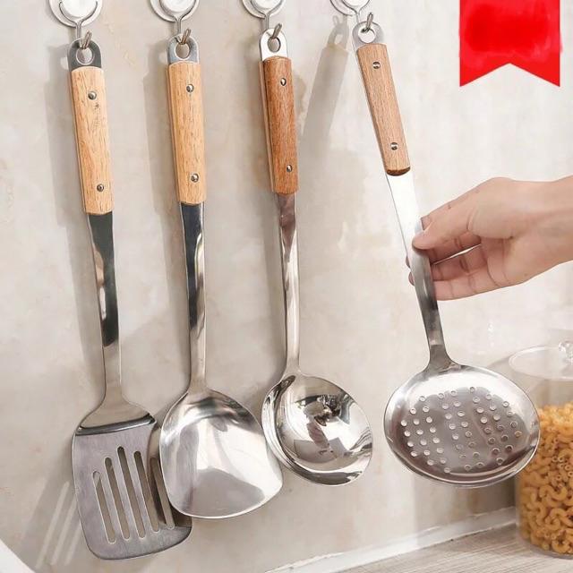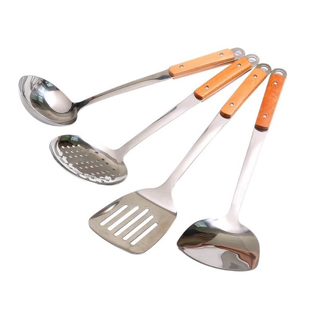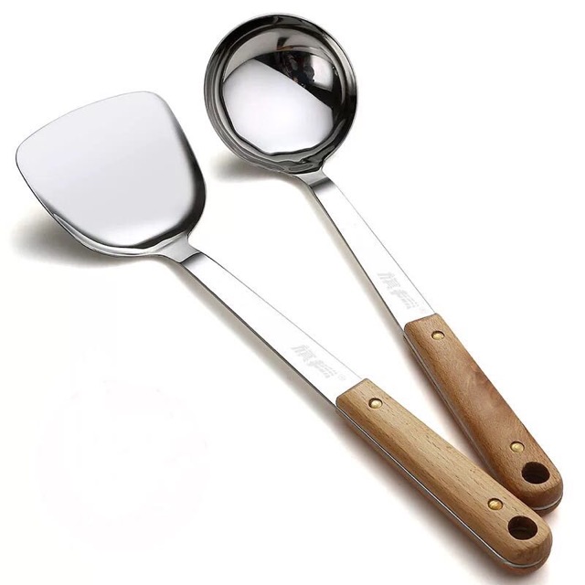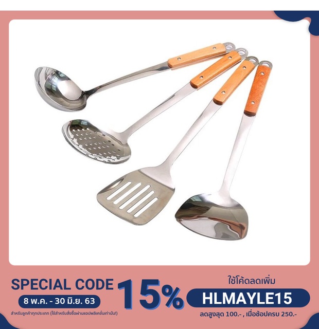 ตะหลิว กระบวย ตะหลิวมีรู กระบวยสุกี้ สเเตนเลสด้ามลายไม้#C014