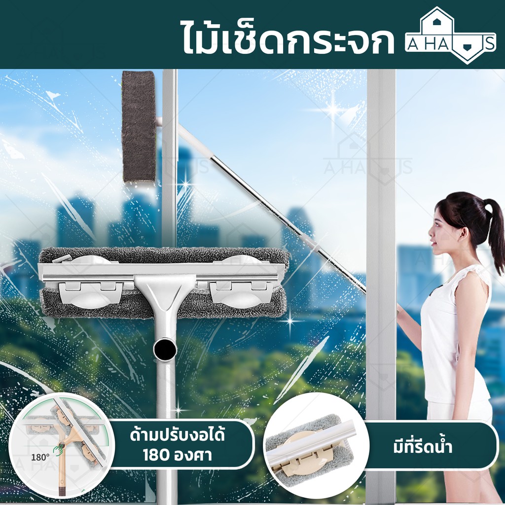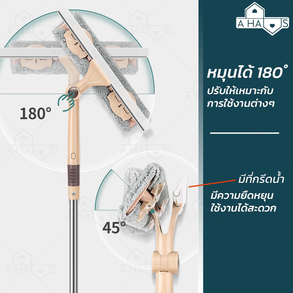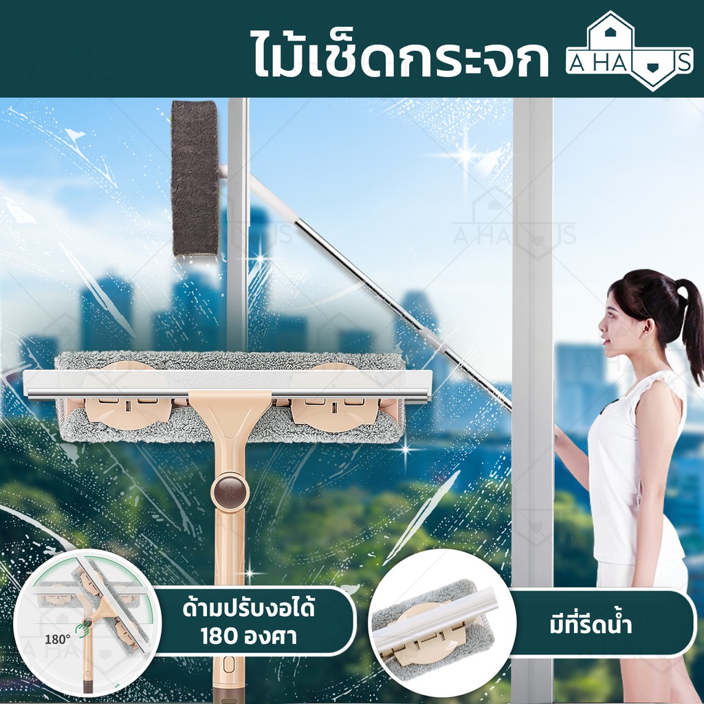 A HAUS ที่เช็ดกระจก ไม้เช็ดกระจก ไม้เช็ดกระจกแบบยาว ปรับได้ 140 ซม พร้อมที่กรีดน้ำ หมุนได้ 180° ผ้าไมโครไฟเบอร์ รุ่นใหม่