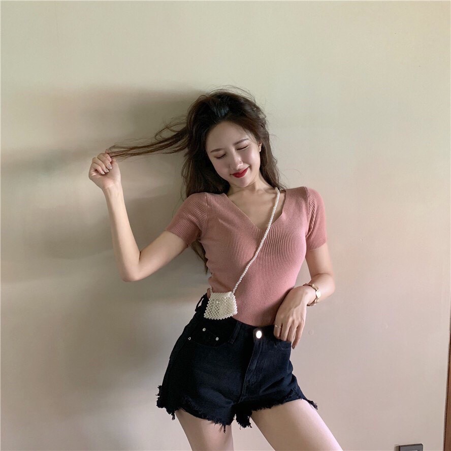 🌟ส่งเร็ว1-2วัน🌟เสื้อคอวีไหมพรม🔥( สีเยอะ 22 สี )🔥 V-neck สีพื้นไหมพรม Free Size #9966