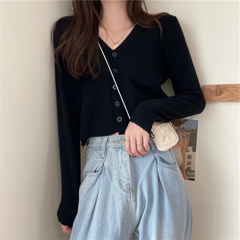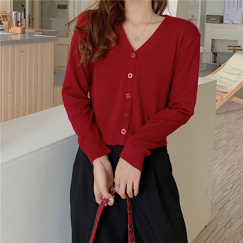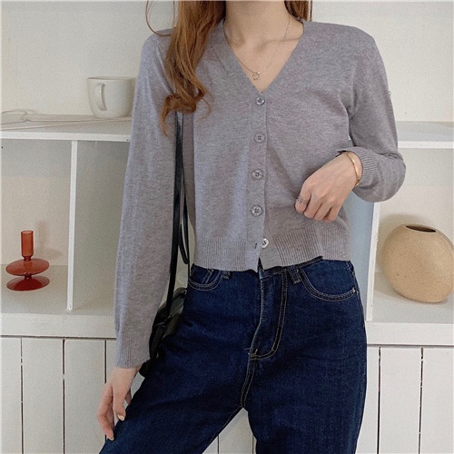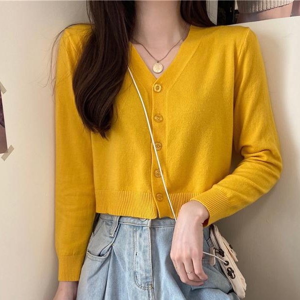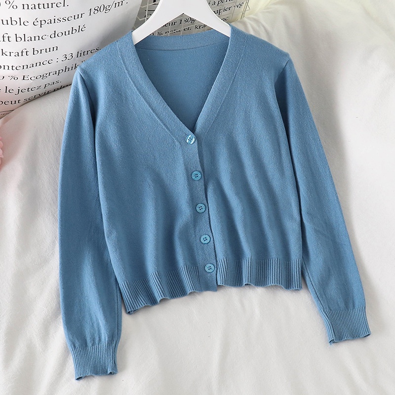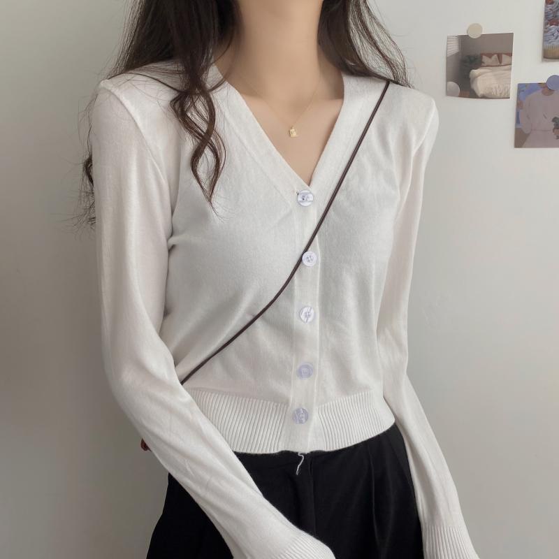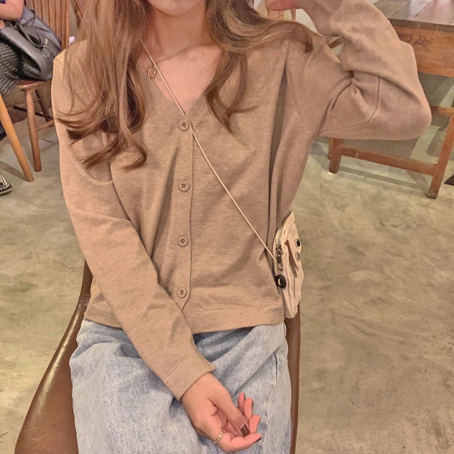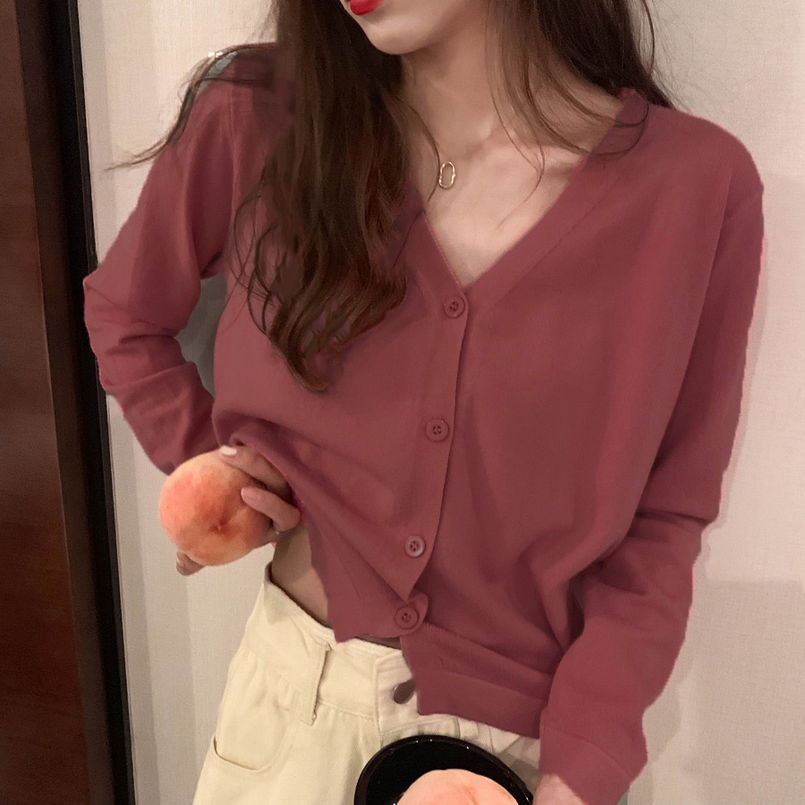 🔥ส่งเร็ว1-2 วัน เสื้อครอปแขนยาวคอวี กันuv ผ้าไหมพรม แบบเกาหลี มีกระดุมหน้า no.29 เส