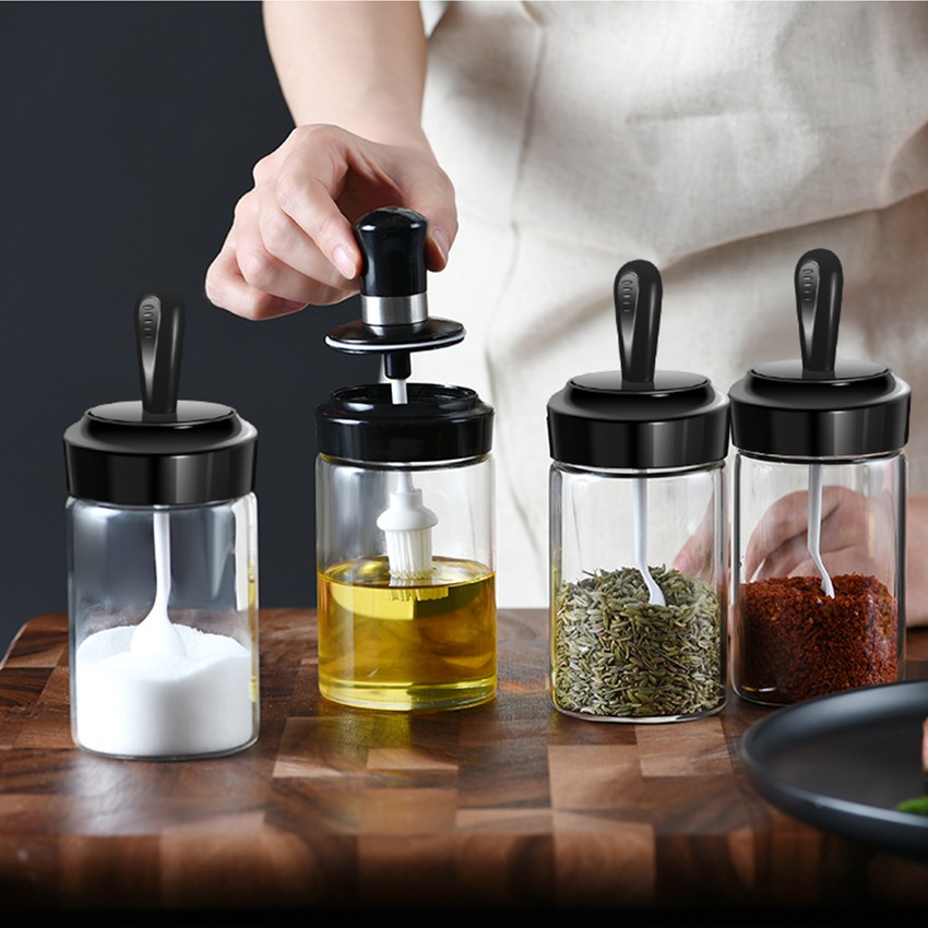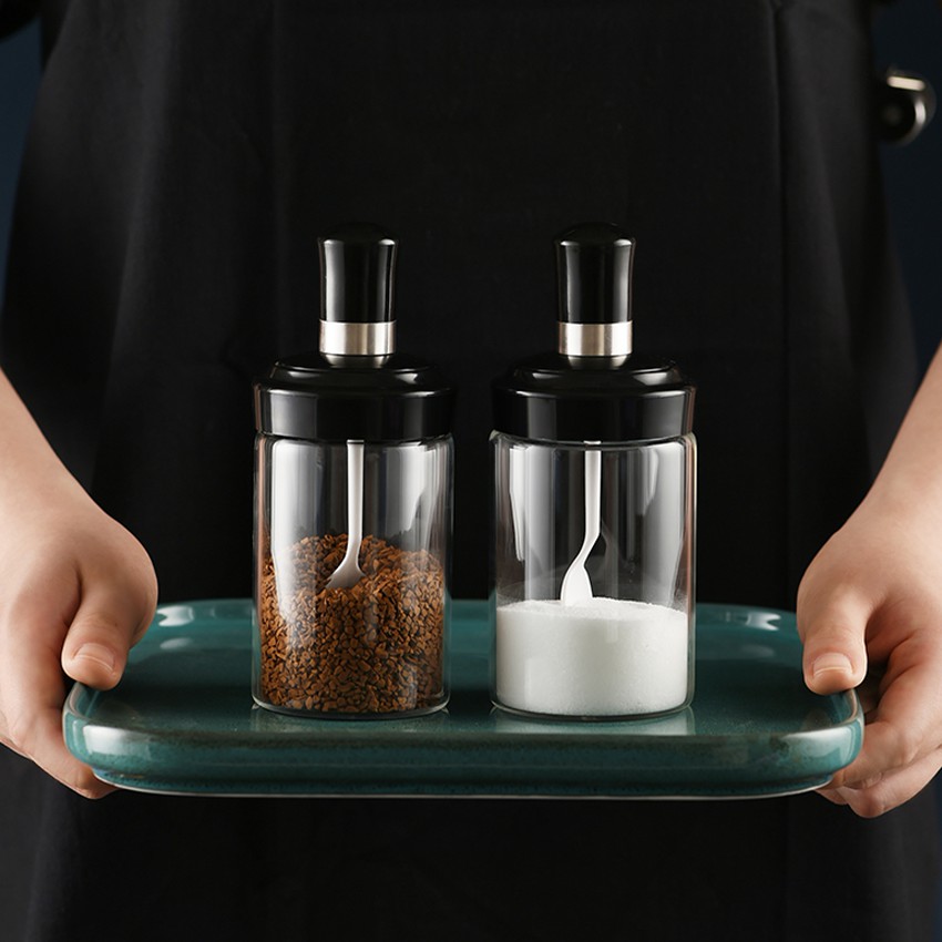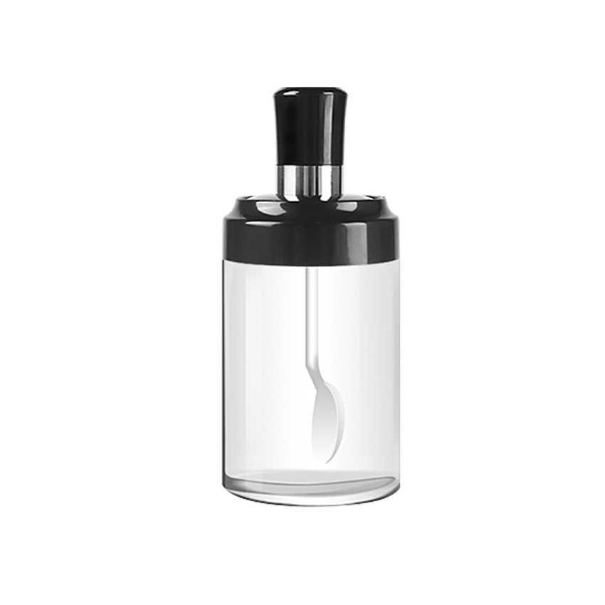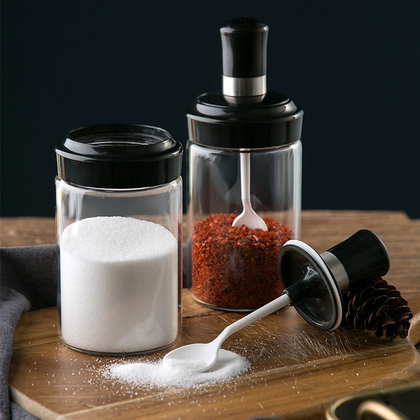 ขวดแก้วใส่เครื่องปรุง กระปุกใส่เครื่องเทศ พร้อมช้อนตักในตัวสีดำ