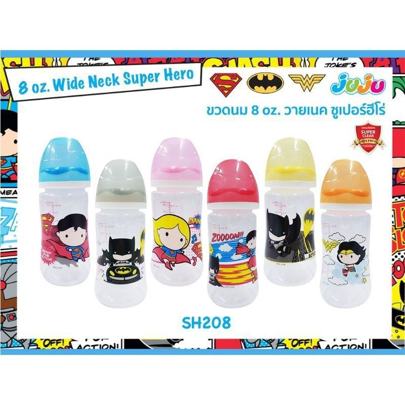 🏅ลิขสิทธิ์แท้💥JuJu SH208-SH209 ขวดนม 8 oz คอกว้าง/คอกว้าง ซุปเปอร์ฮีโร่ แถมจุกนมในขวดลดการท้องอึด