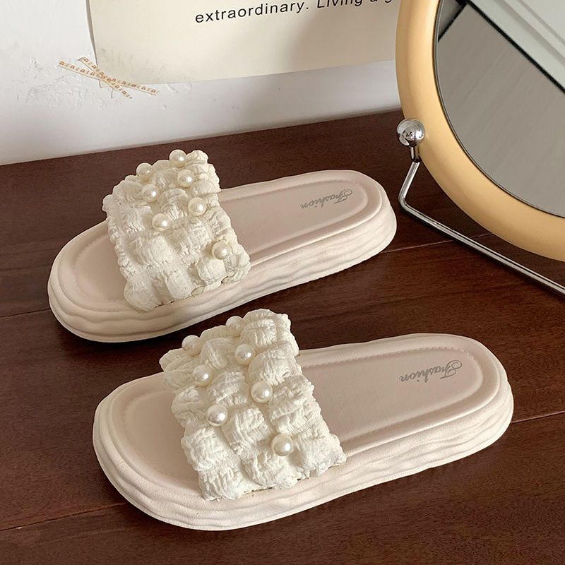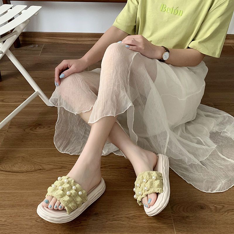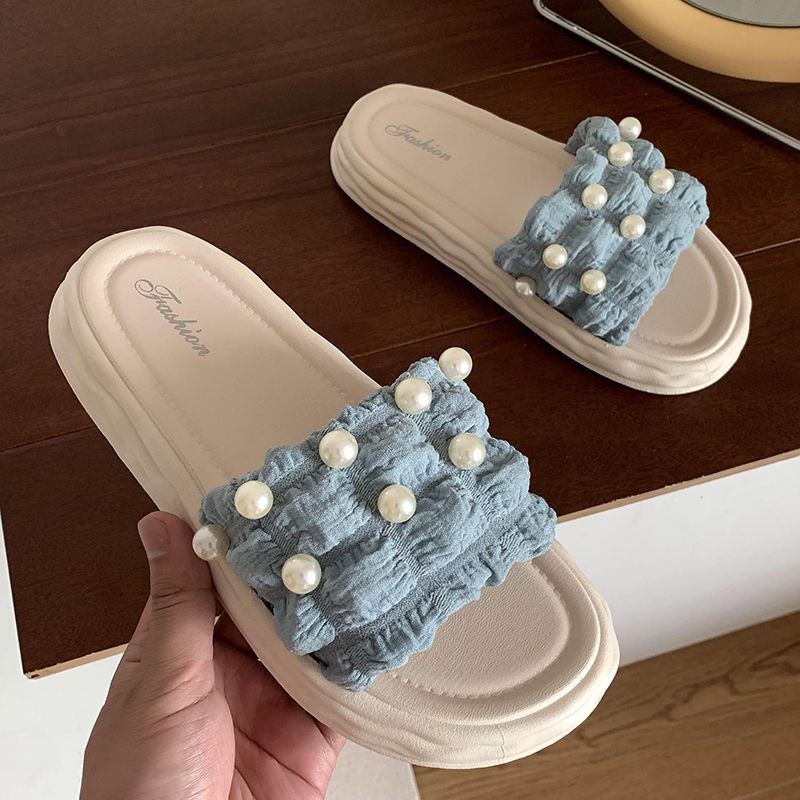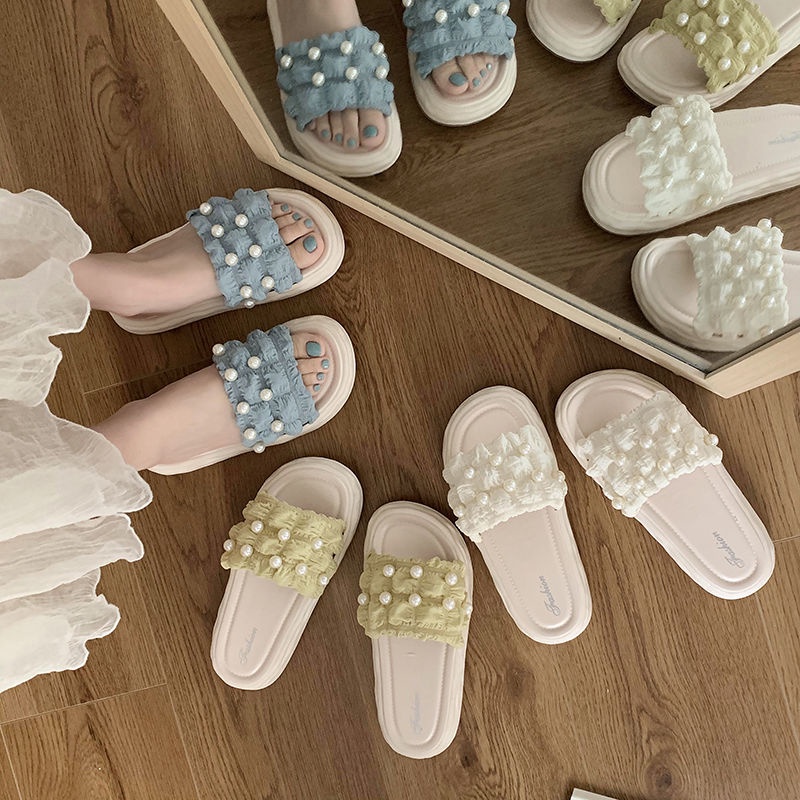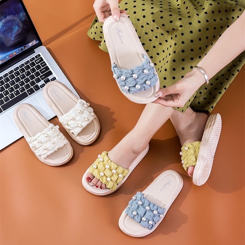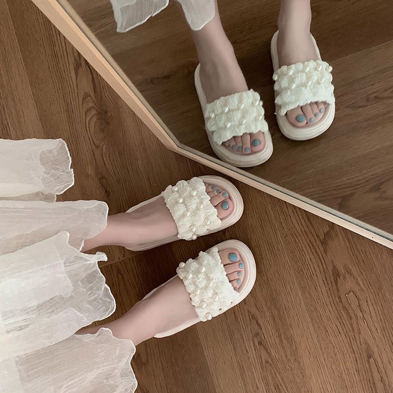 รองเท้าแบบสวมส้นหนา แฟชั่นผู้หญิง ตกแต่งไข่มุก สินค้าพร้อมส่ง