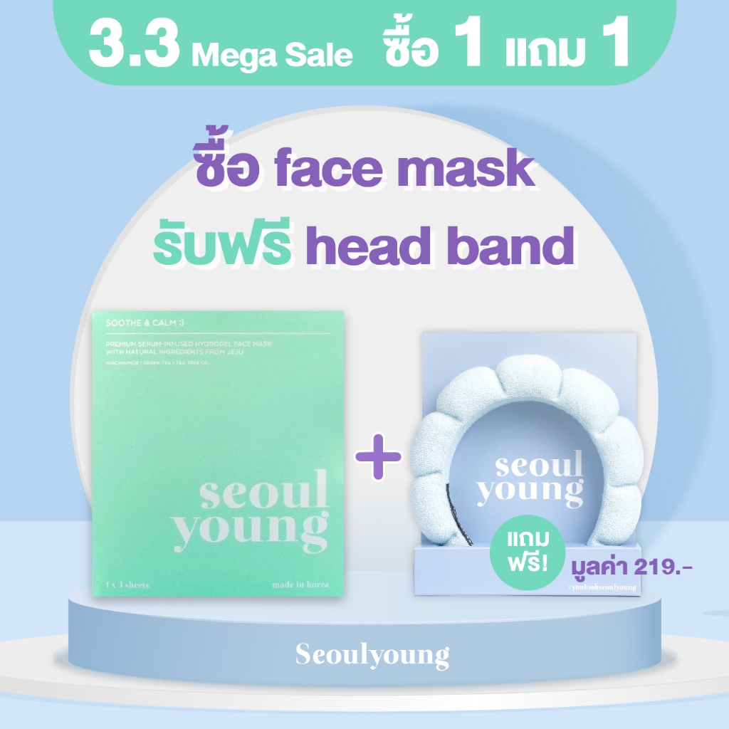 [แถมคาดผมสีฟ้า] มาร์คหน้าเกาหลี seoulyoung Soothe & Calm :) (3 แผ่น) มาร์คหน้าลดสิว ลดผดผื่น จากการใส่หน้ากากอ