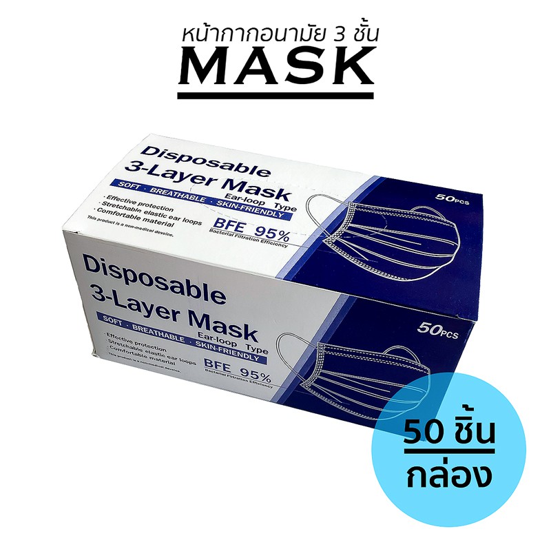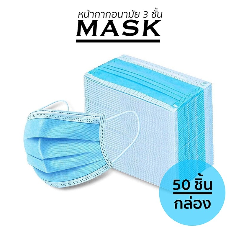 พร้อมส่ง📌 Face Mask หน้ากากอนามัย 1 กล่อง 50 ชิ้น หนา 3 ชั้น ป้องกันละอองน้ำ