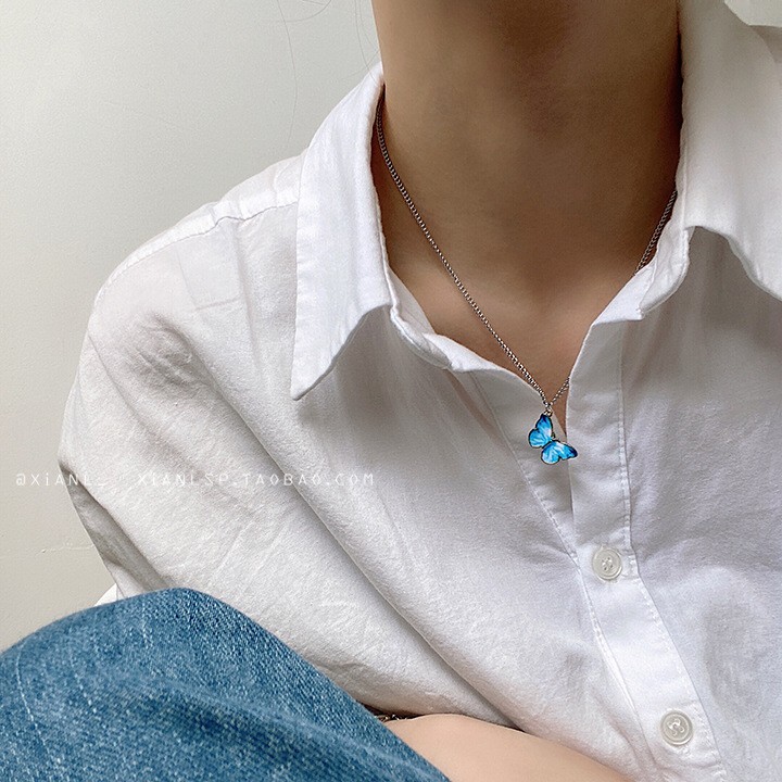 สร้อยคอรูปผีเสื้อ โซ่จี้ผีเสื้อคลาสสิกสีฟ้าสีน้ำเงิน สไตล์เกาหลีเครื่องประดับคู่รัก