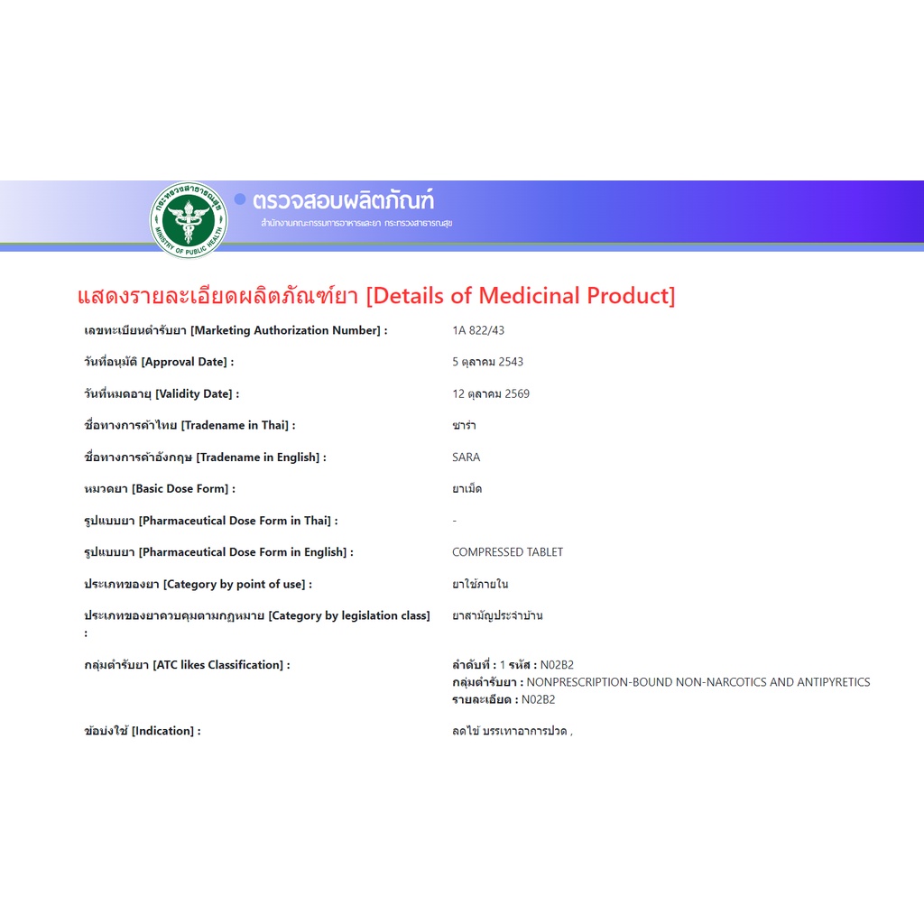 SaRa ซาร่า ลดไข้ พาราเซตามอล 500 มก. แผงละ 10 เม็ด