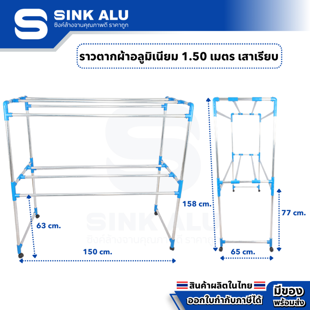 ราวตากผ้า อลูมิเนียม เสาลาย 1.50 เมตร 8 เส้น ราวตากผ้ามีล้อ ราวแขวนเสื้อ FF-001 ราวแขวน ราวแขวนผ้า Aluminium