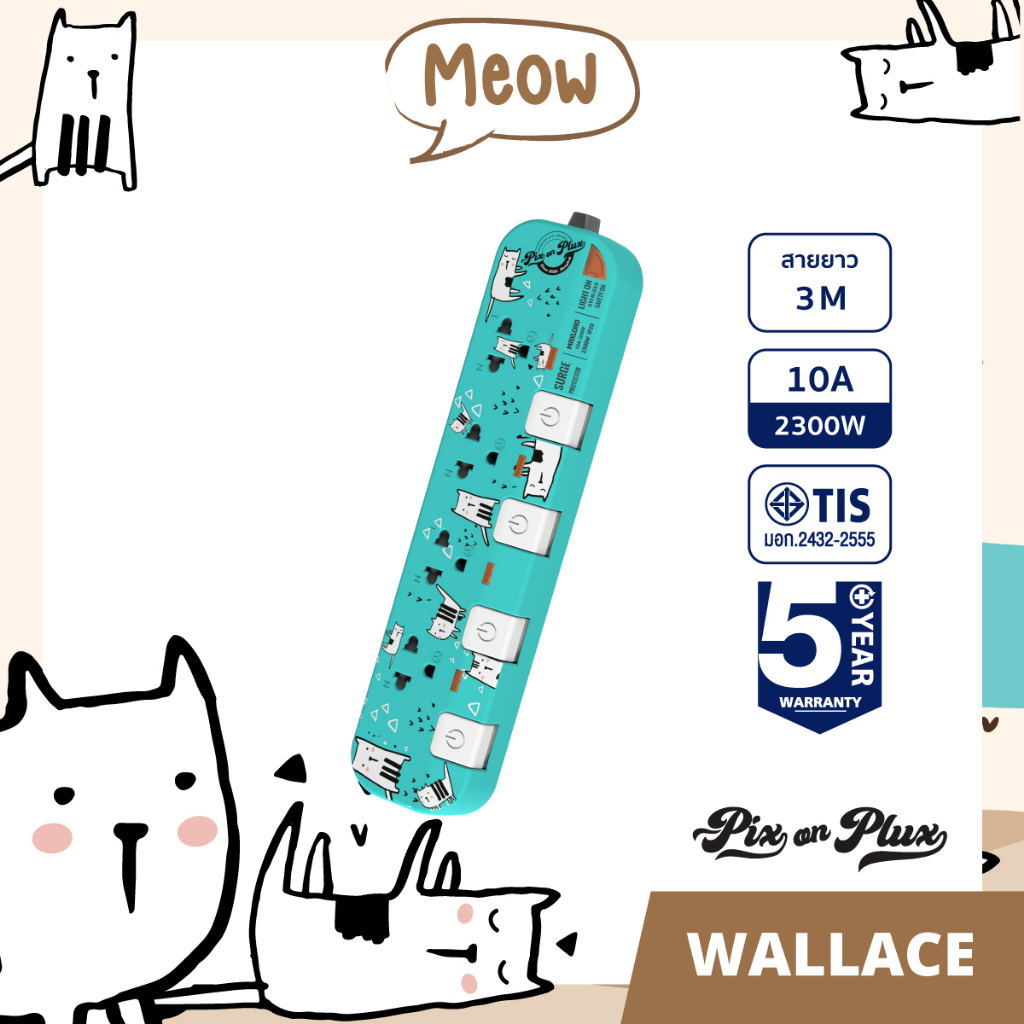 PixonPlux ปลั๊กไฟ ลาย " เหมียว เหมียว" 2,4 ช่อง + 2USB VCT3x0.75 -3 M ปลั๊กมอก ปลั๊กพ่วง