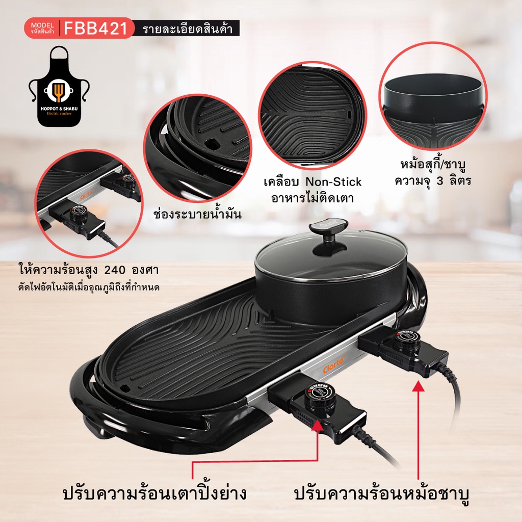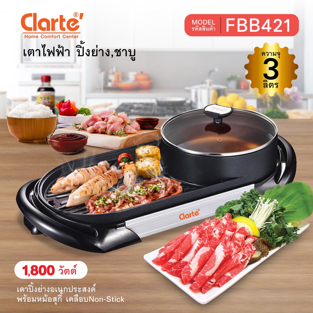 [ฉลองครบรอบ23ปี]Clarte'เตาปิ้งย่างอเนกประสงค์แบบชาบูหมูกระทะ Non-Stick1,800 วัตต์ รุ่น FBB421B