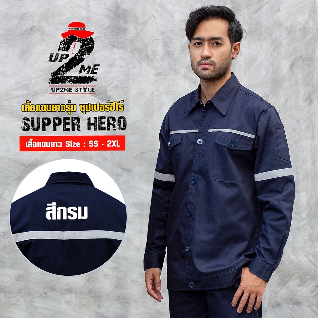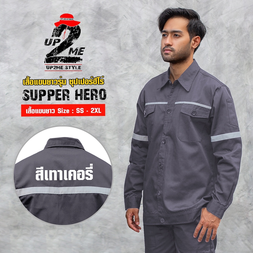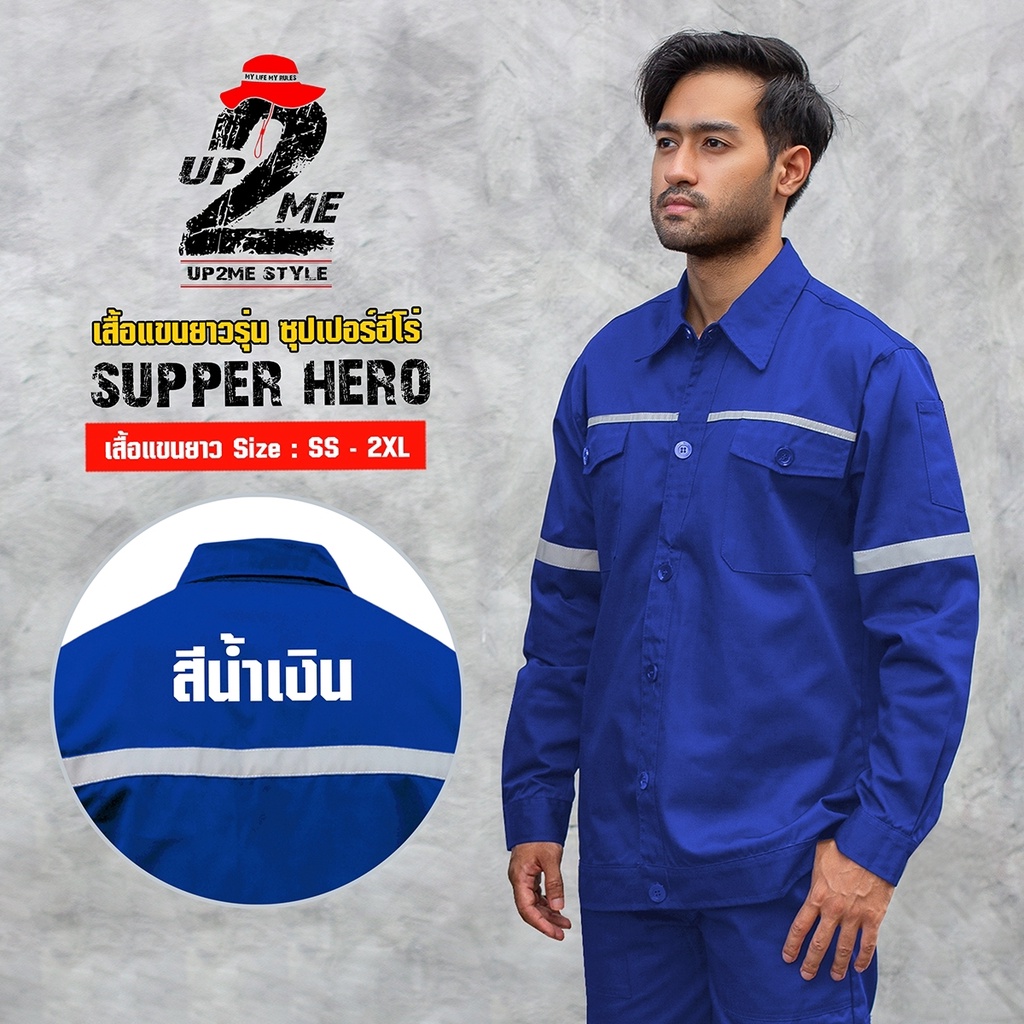 UP2ME :เสื้อช็อปแขนยาว รุ่น Super Hero ทำงานช่าง ช่างไฟ ติดแถบสะท้อนแสง อก 37-52 นิ้ว WORKWEARTHAILAND