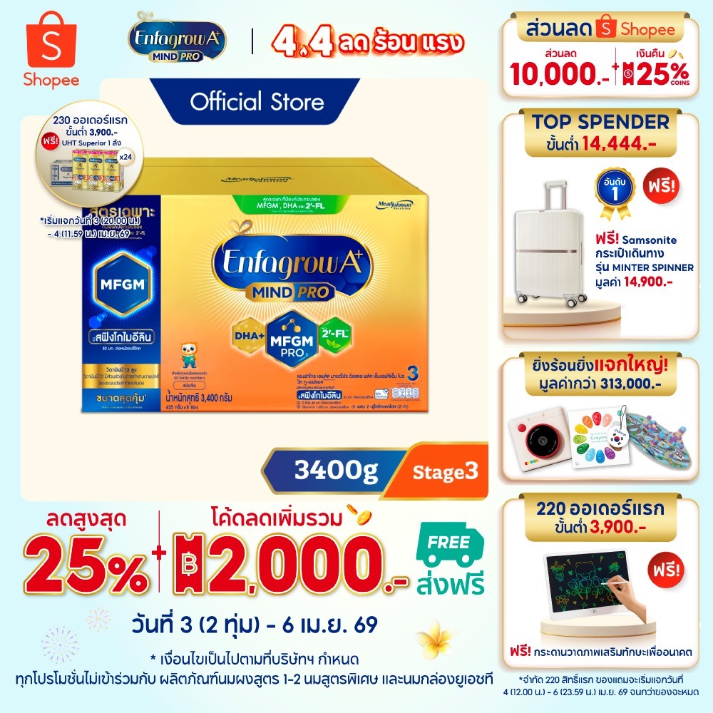 นมผง เอนฟาโกร เอพลัส มายด์โปร สูตร3 ชนิดจืด (3400 กรัม) Enfagrow A+ MindPro Stage3 Plain (3400 g)