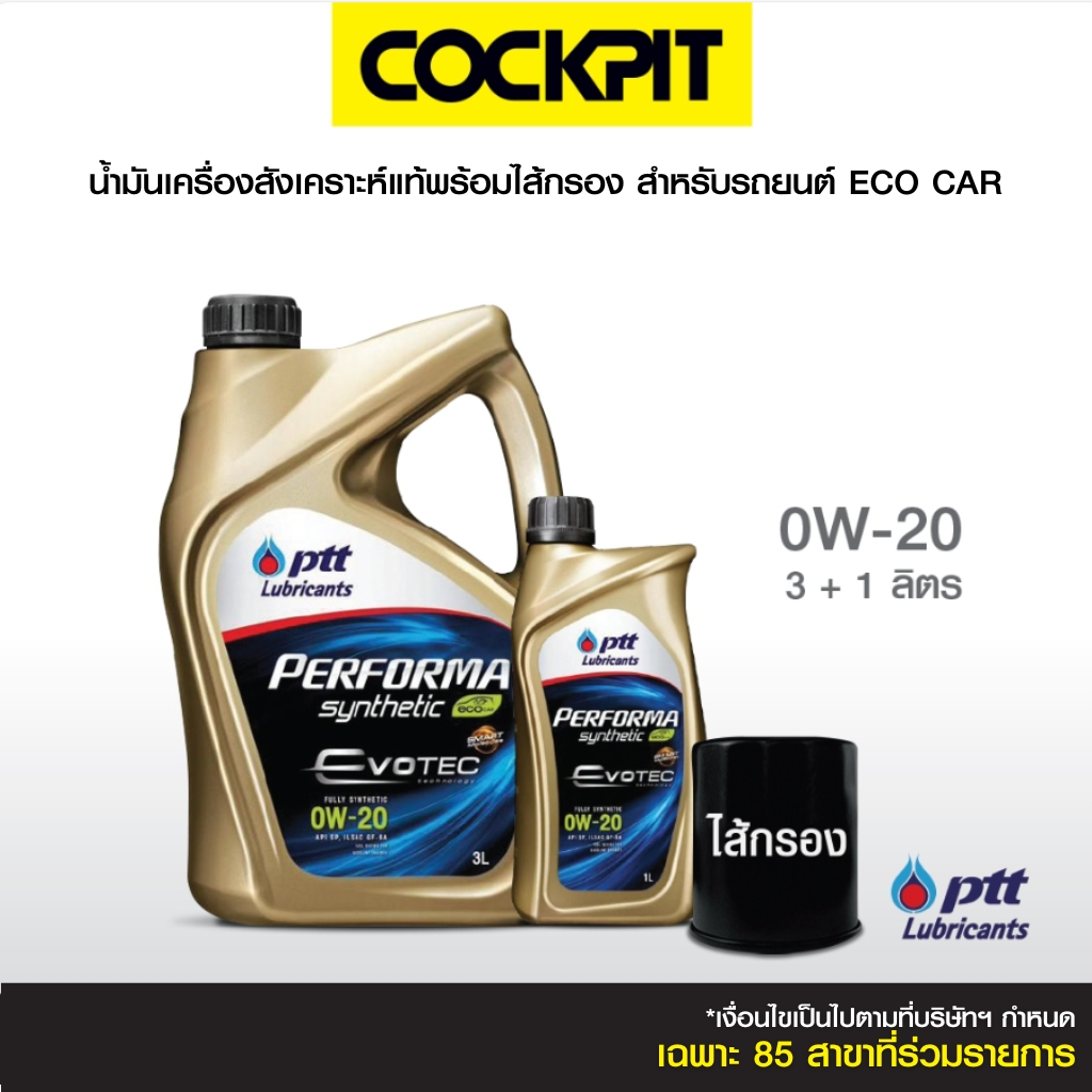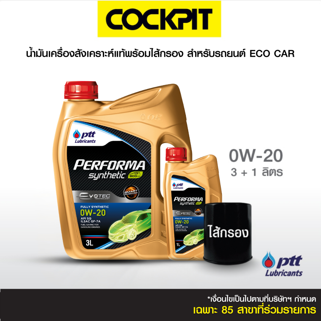 PTT PERFORMA SYNTHETIC ECO 0W-20 น้ำมันเครื่องสังเคราะห์แท้ สำหรับEco Car 3ลิตร แถม1ลิตร ฟรีไส้กรอง ที่ค็อกพิท85สาขา
