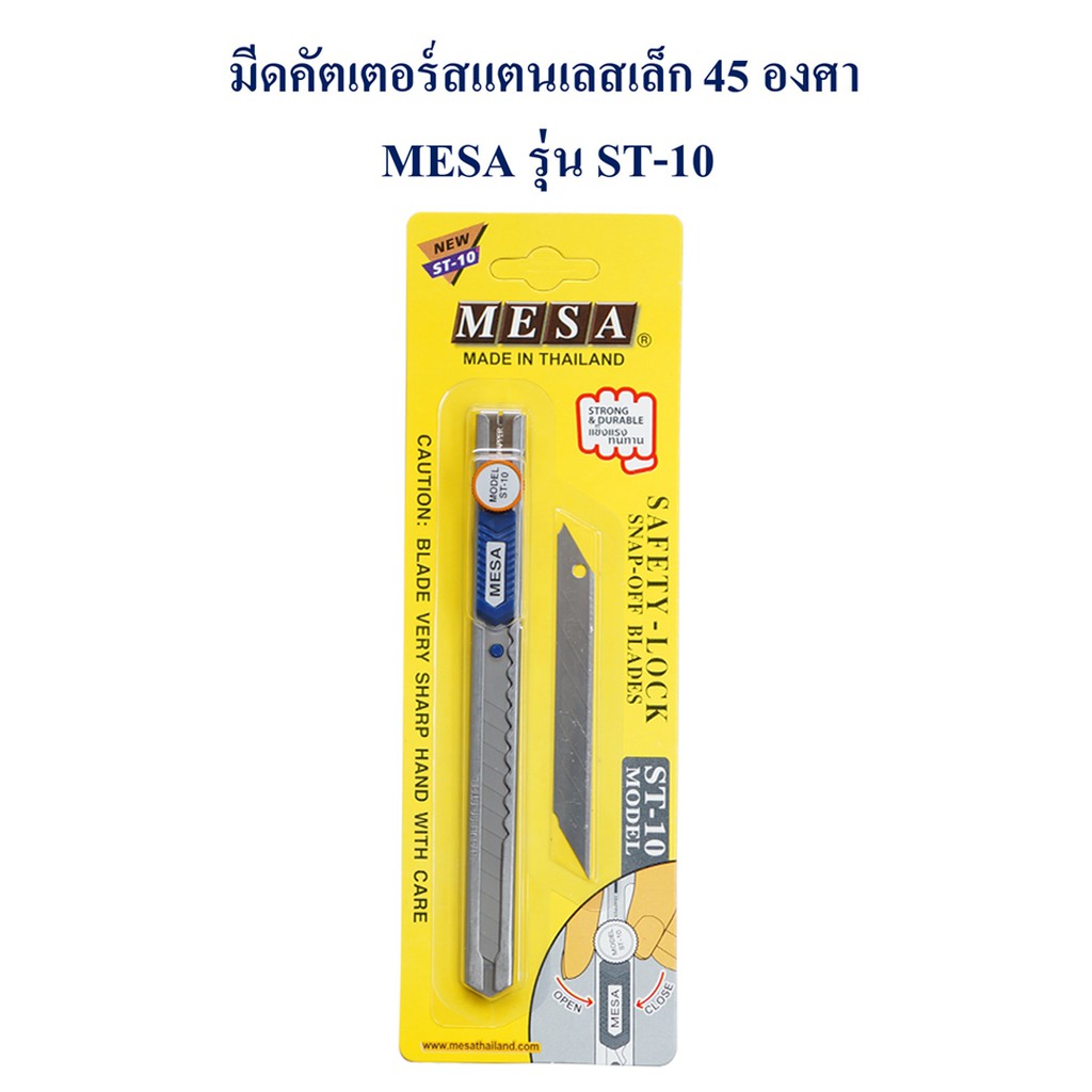 คัตเตอร์ ด้ามสแตนเลส เล็ก 9 มม. 45 องศา (แถมใบมีดสำรอง 30 องศา) มีปุ่มล็อค รุ่น ST-10 MESA