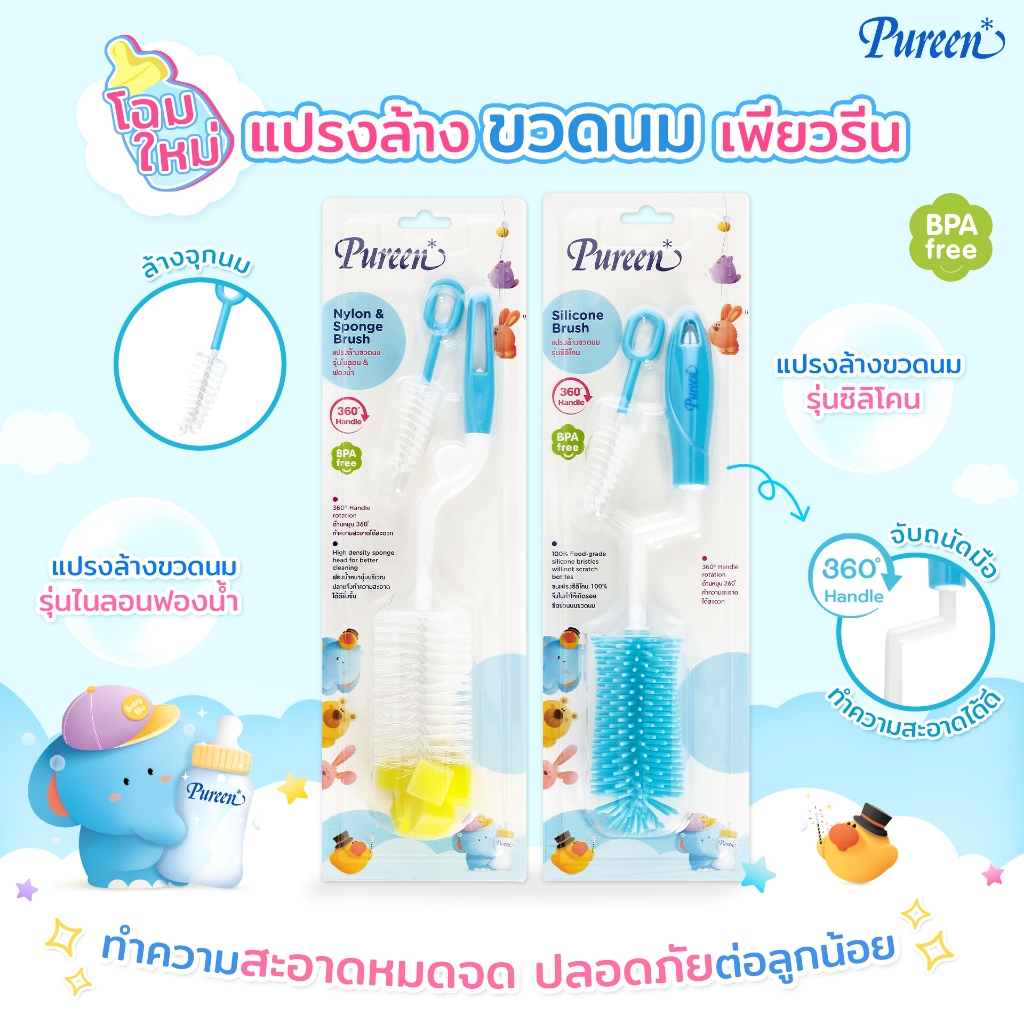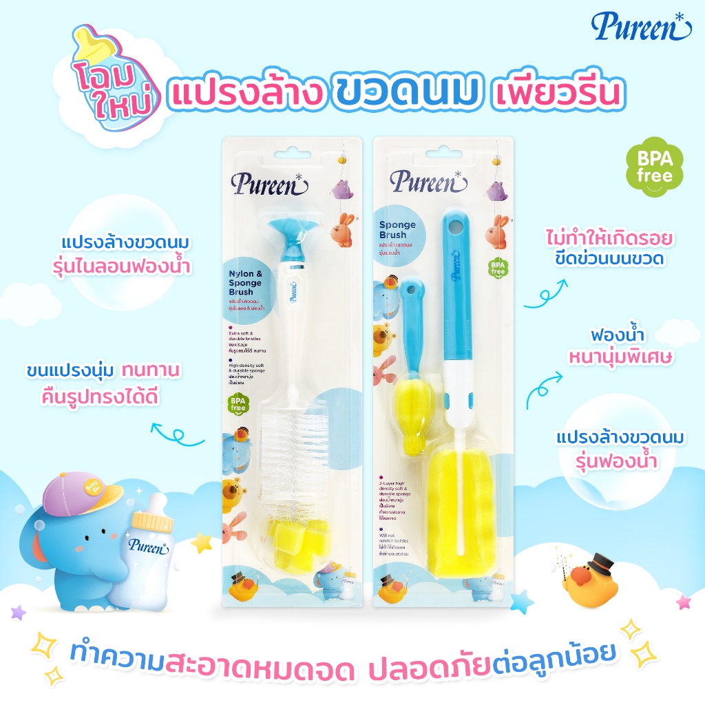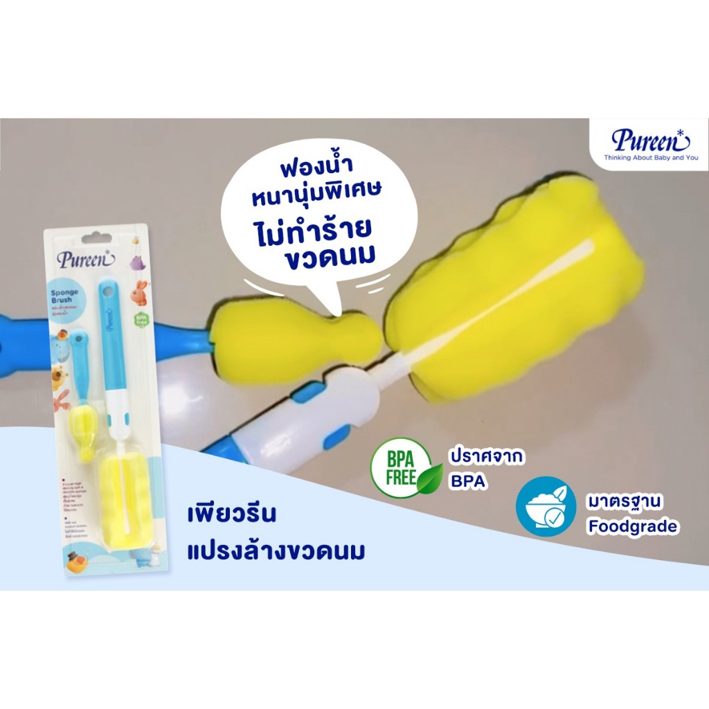 Pureen เพียวรีน แปรงล้างขวดนม + แปรงล้างจุกนม รุ่นฟองน้ำ (คละสี) หนานุ่มเป็นพิเศษ ทำความสะอาดได้ทั่วถึง ลดการอับชื้น
