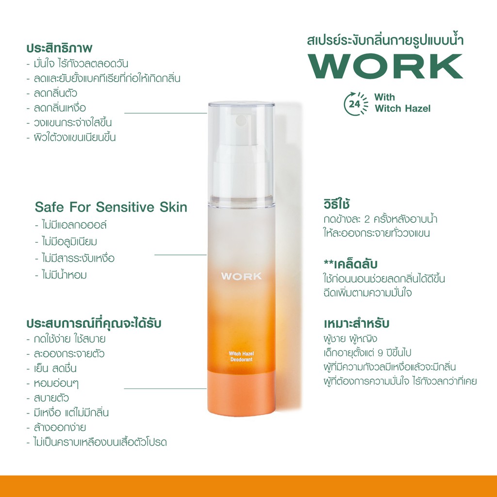 WORK Deodorant Spray 2ขวด : ไม่มีอลูมิเนียม ไม่มีแอลกอฮอล์ ระงับกลิ่นกาย กลิ่นตัว กลิ่นเหงื่อ กลิ่นเต่า ไม่มีคราบ