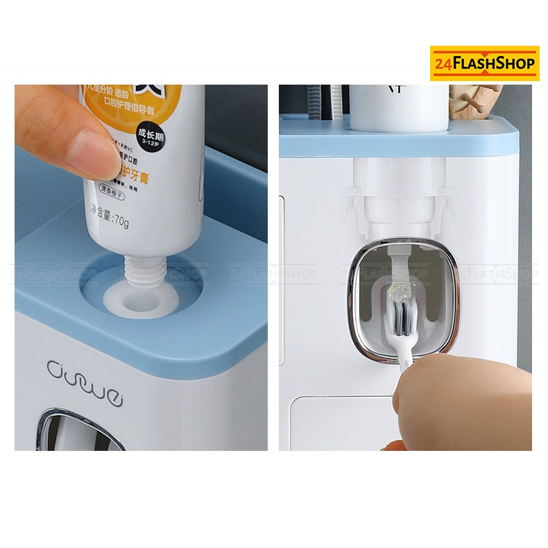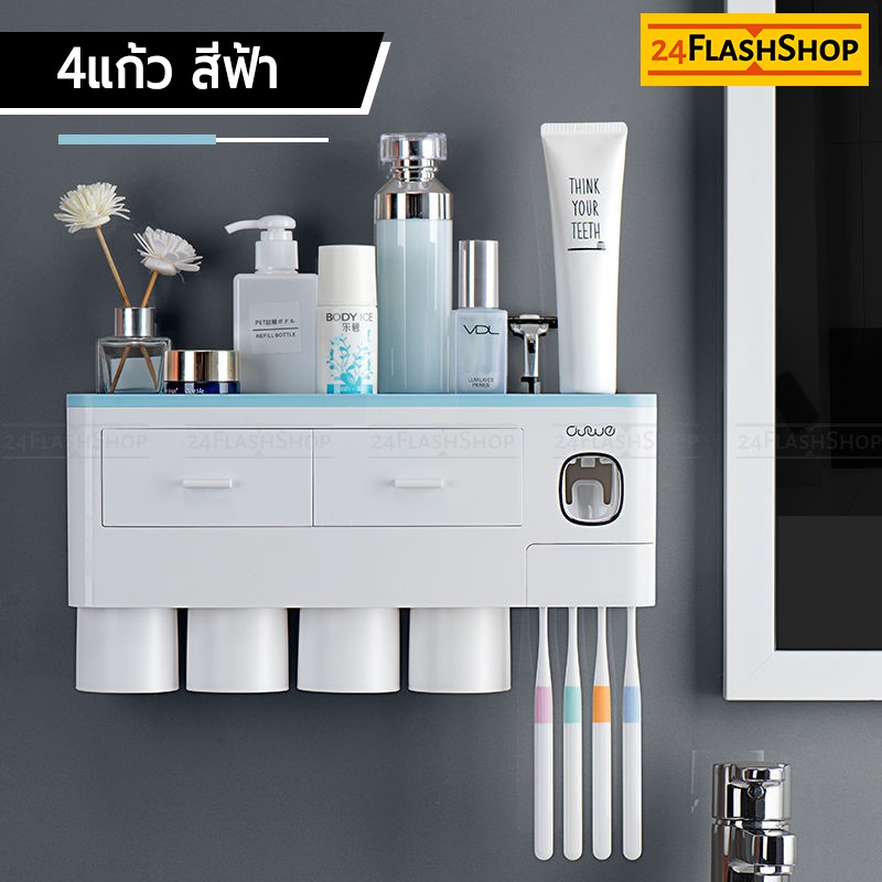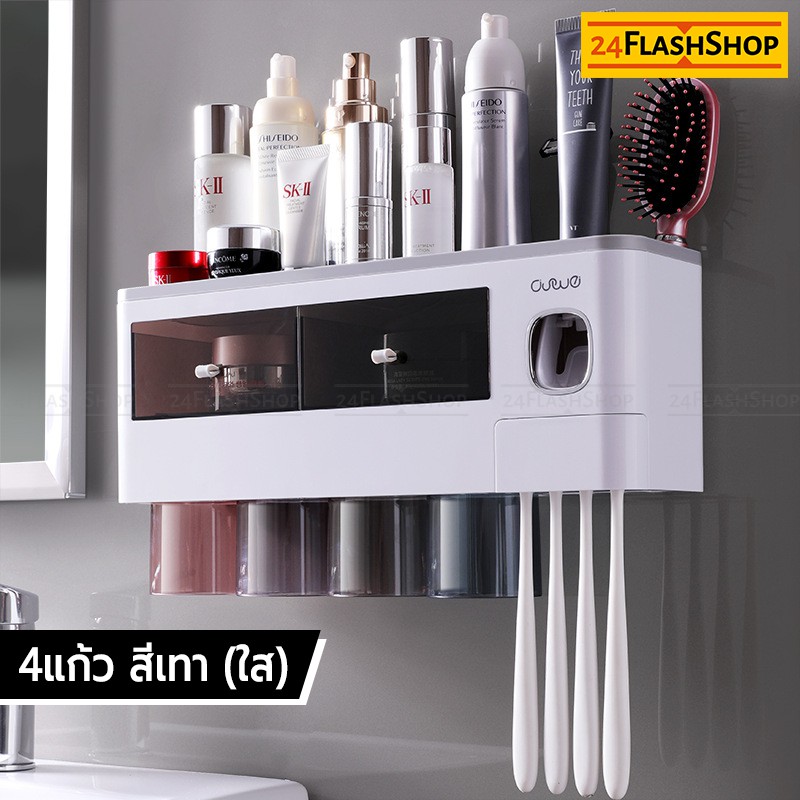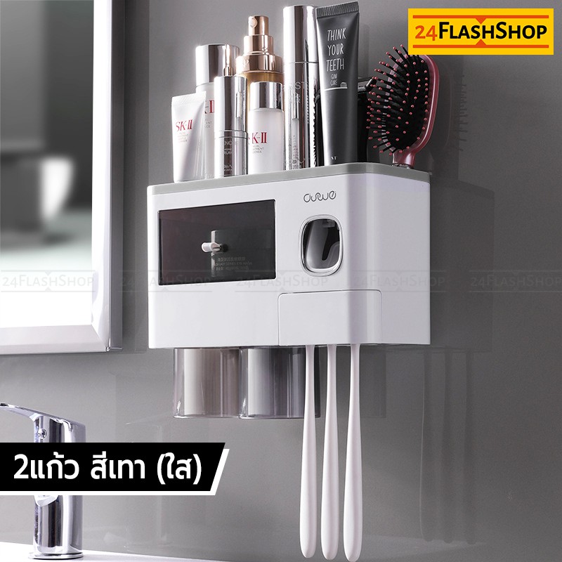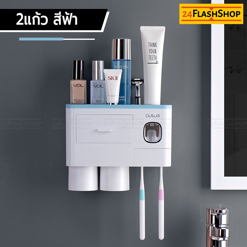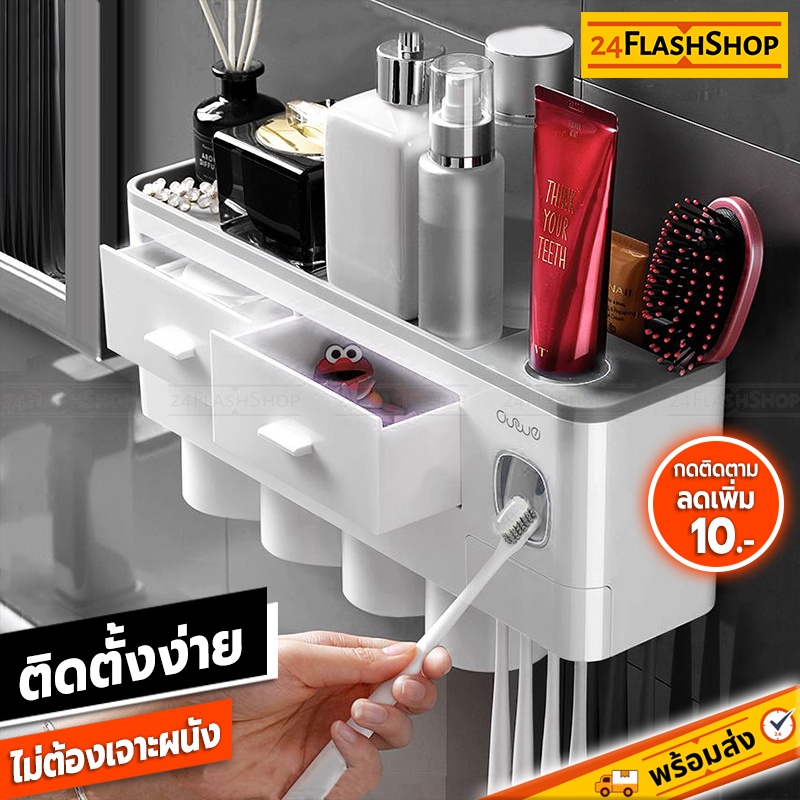 ที่บีบยาสีฟันอัตโนมัติ มีที่เก็บแปรงสีฟันพร้อมแก้วน้ำในตัว แบบติดผนัง ติดตั้งง่าย