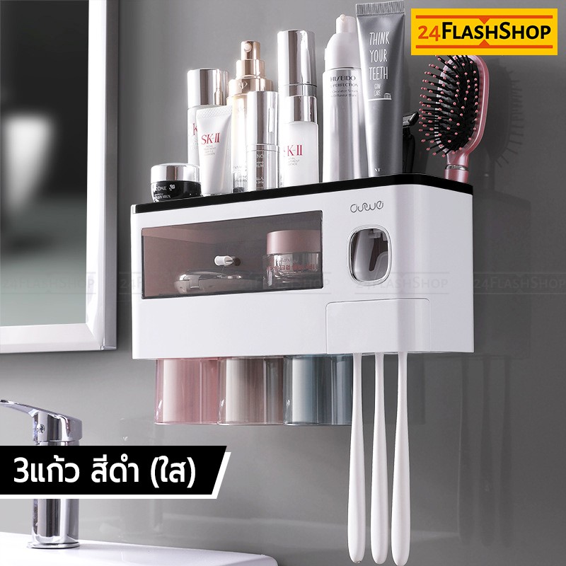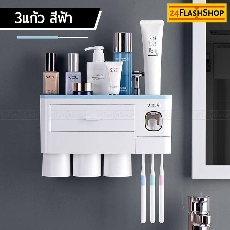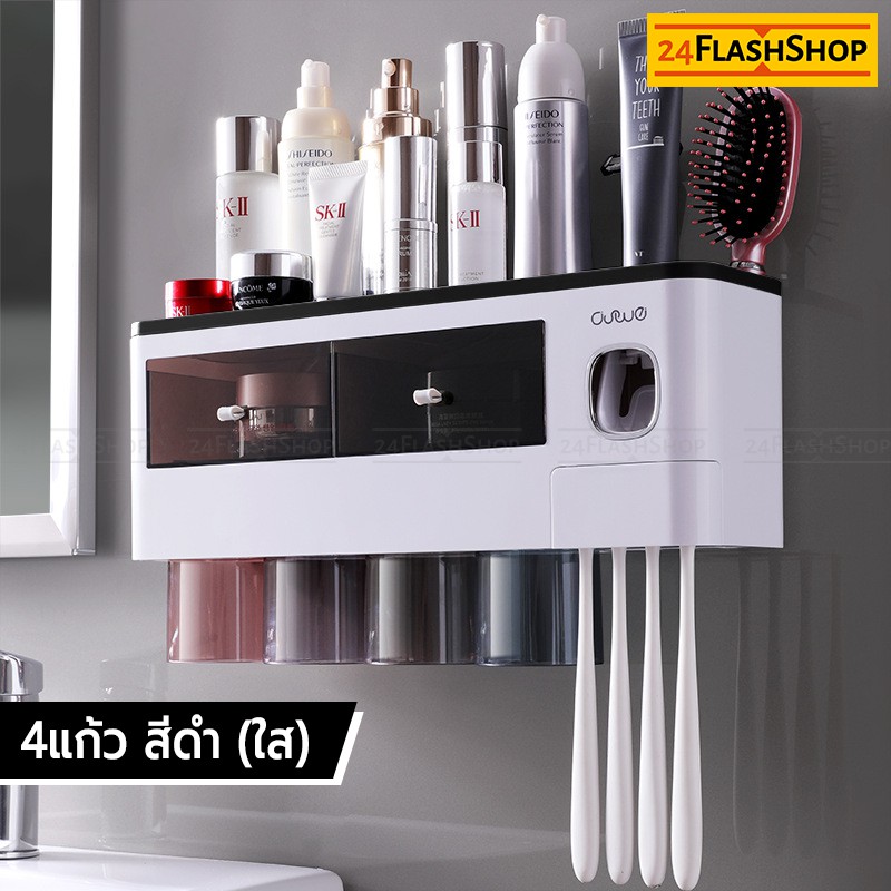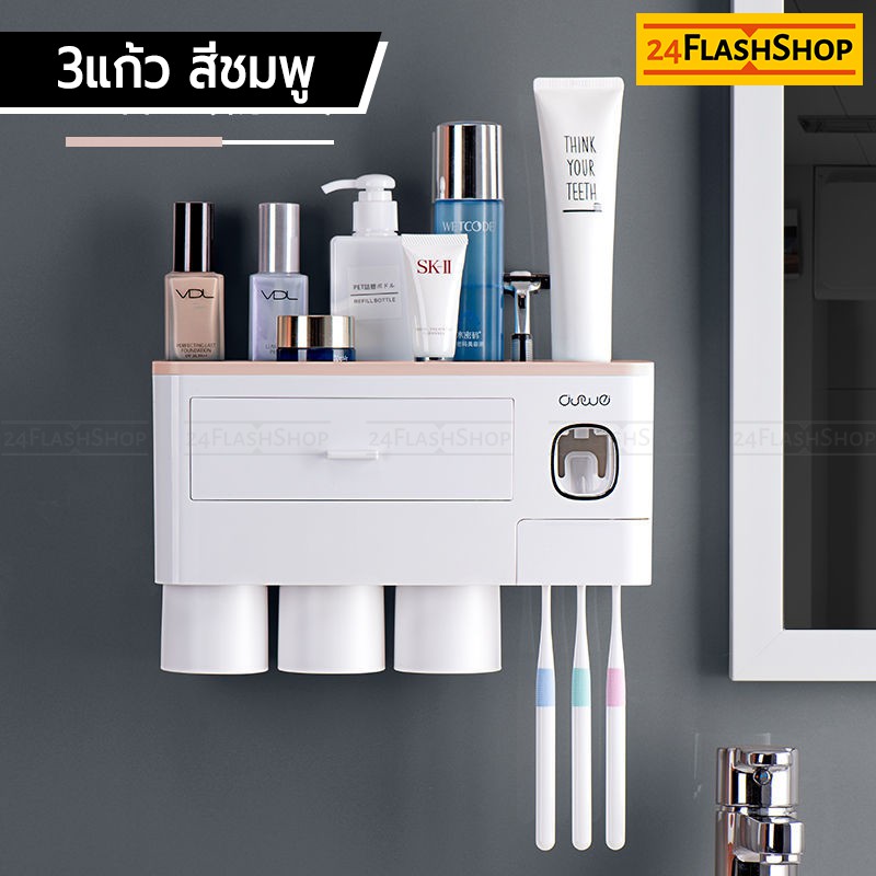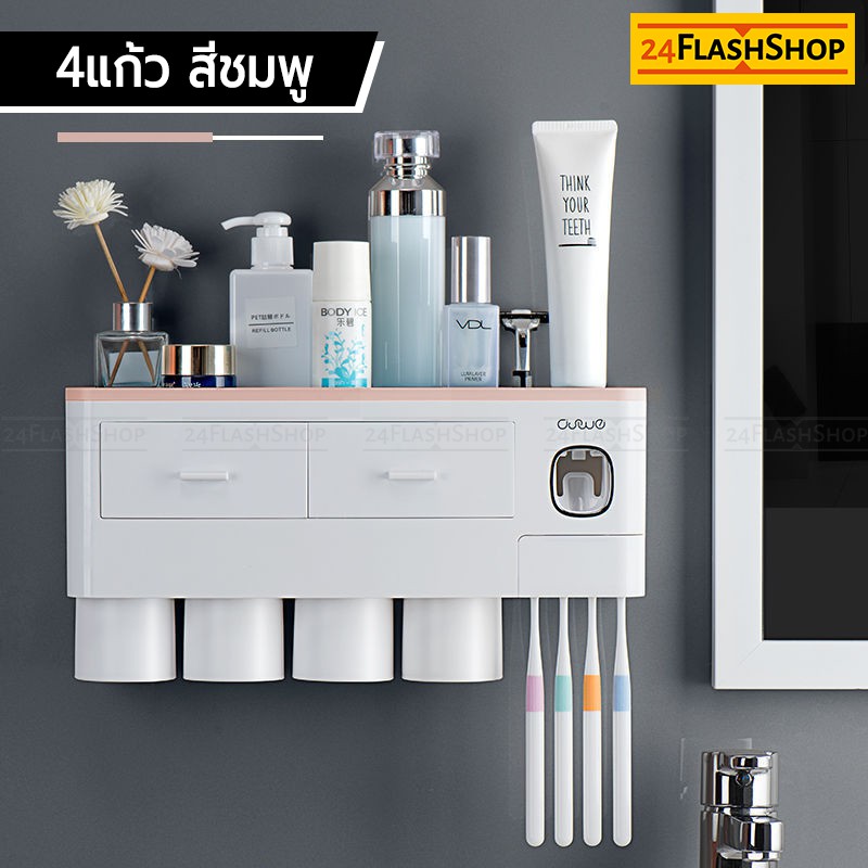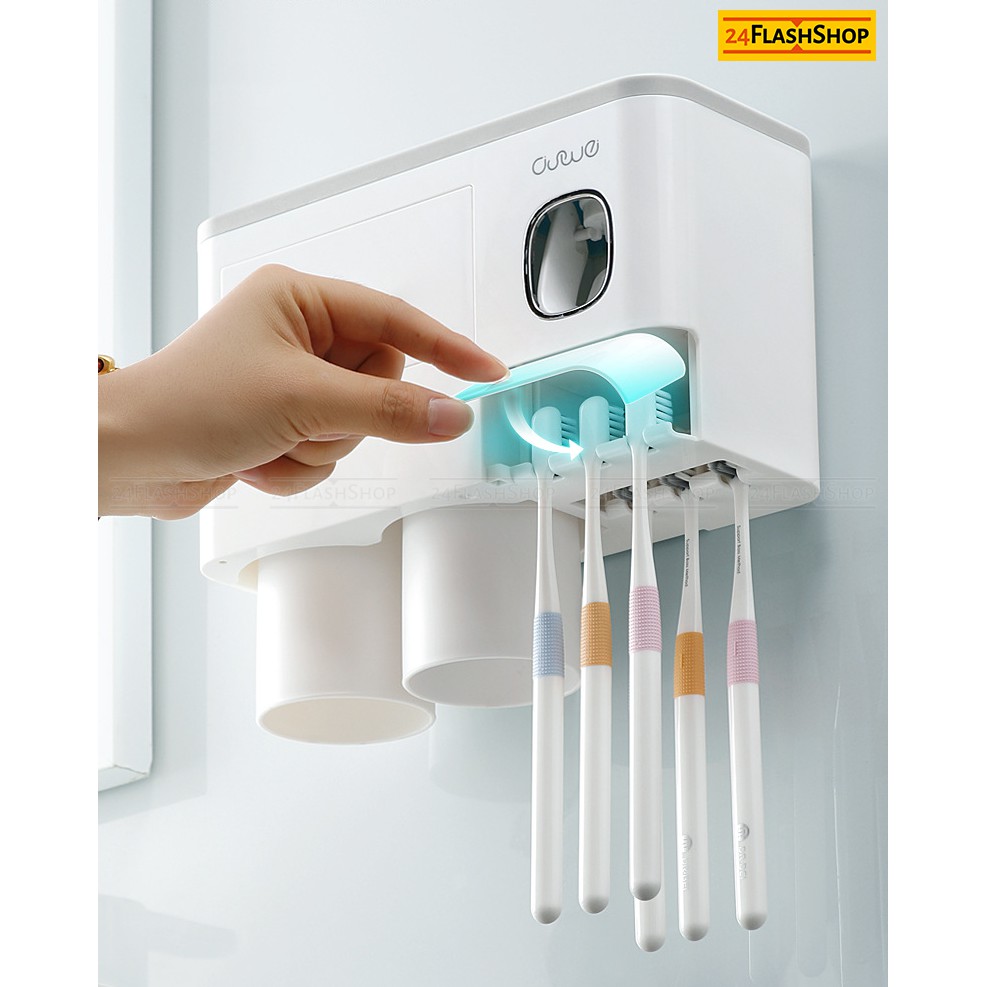 ที่บีบยาสีฟันอัตโนมัติ มีที่เก็บแปรงสีฟันพร้อมแก้วน้ำในตัว แบบติดผนัง ติดตั้งง่าย