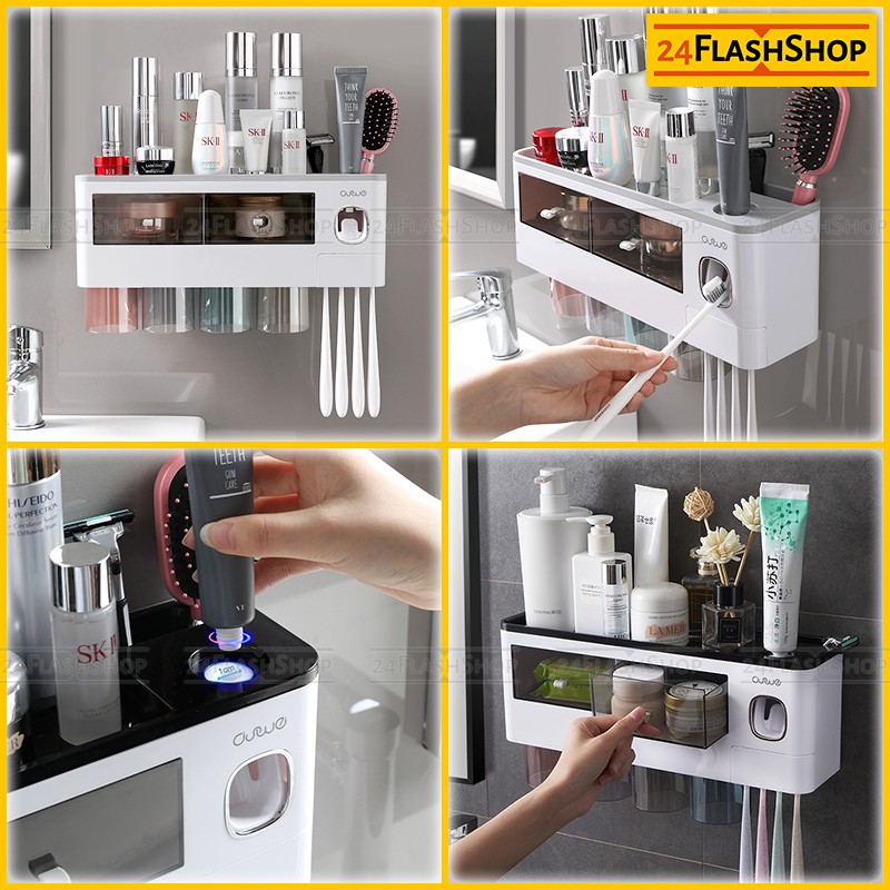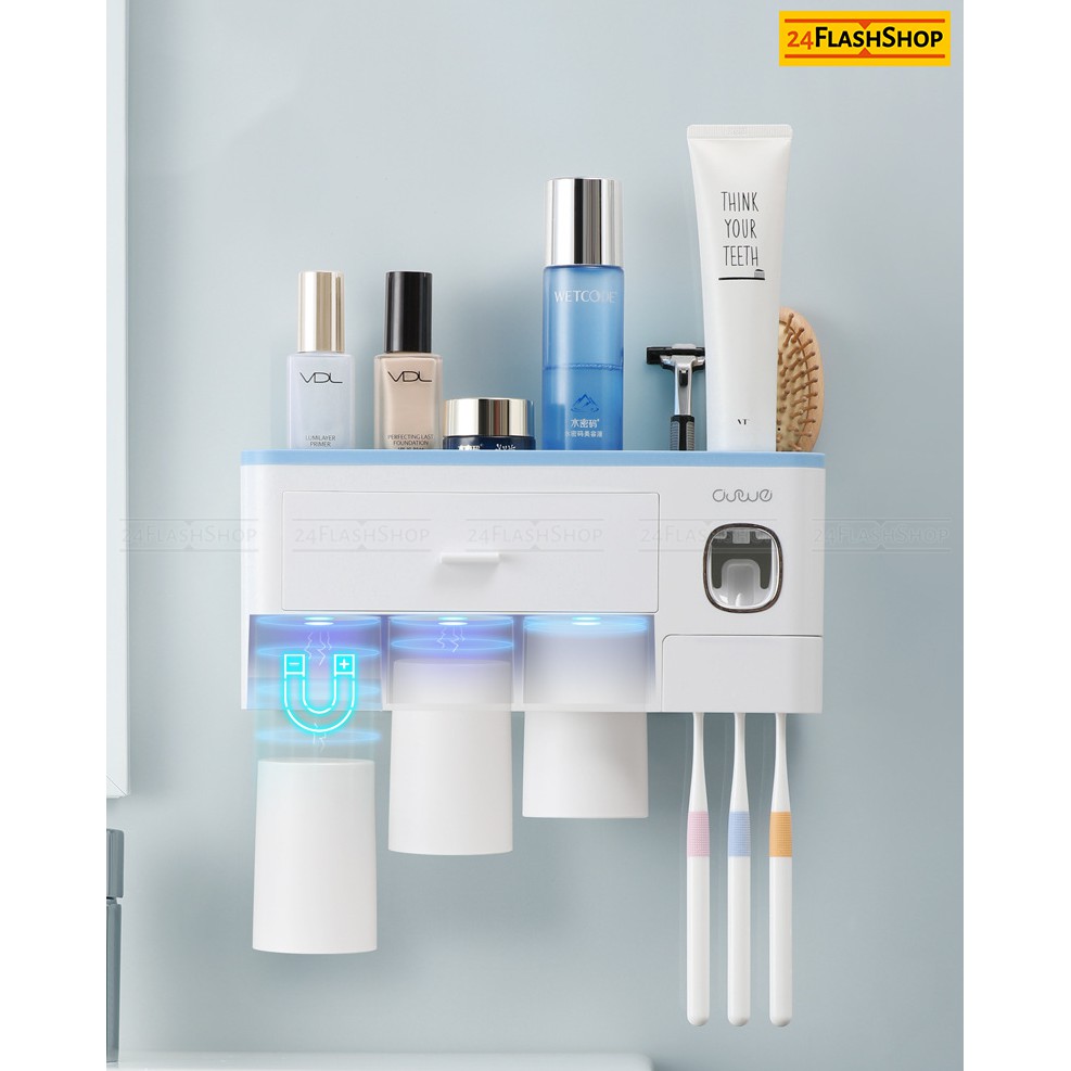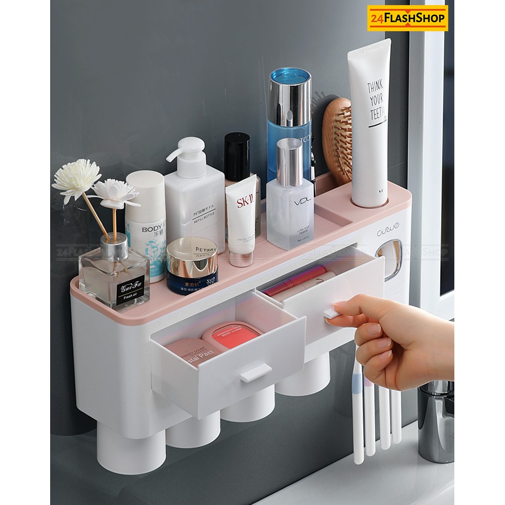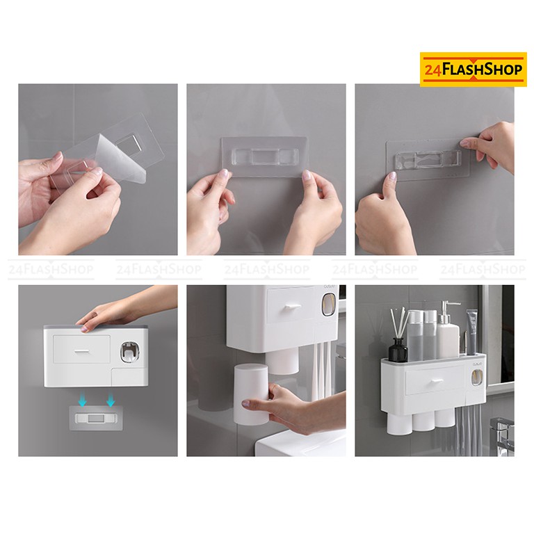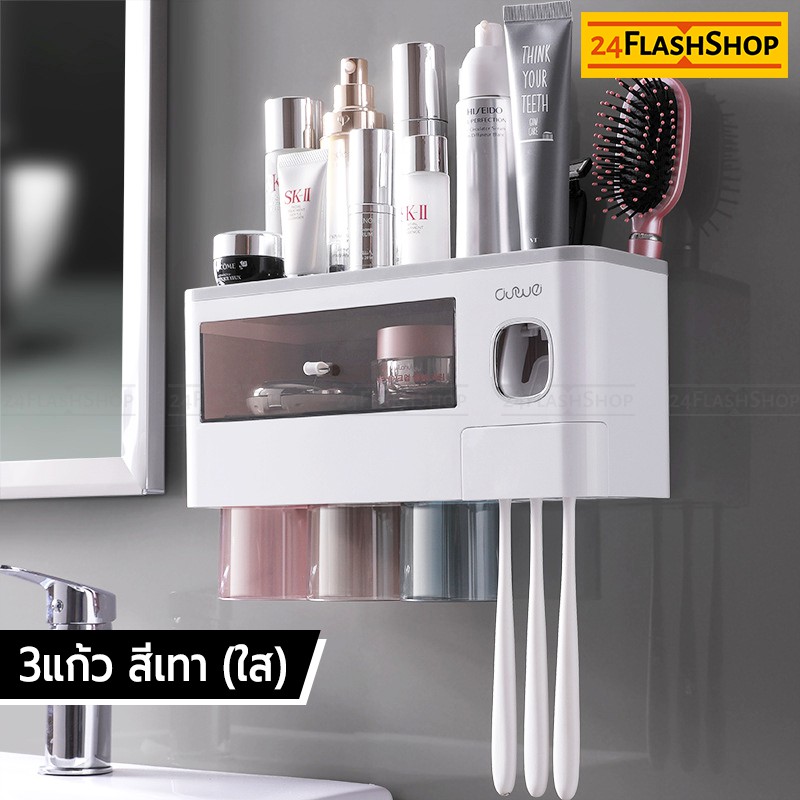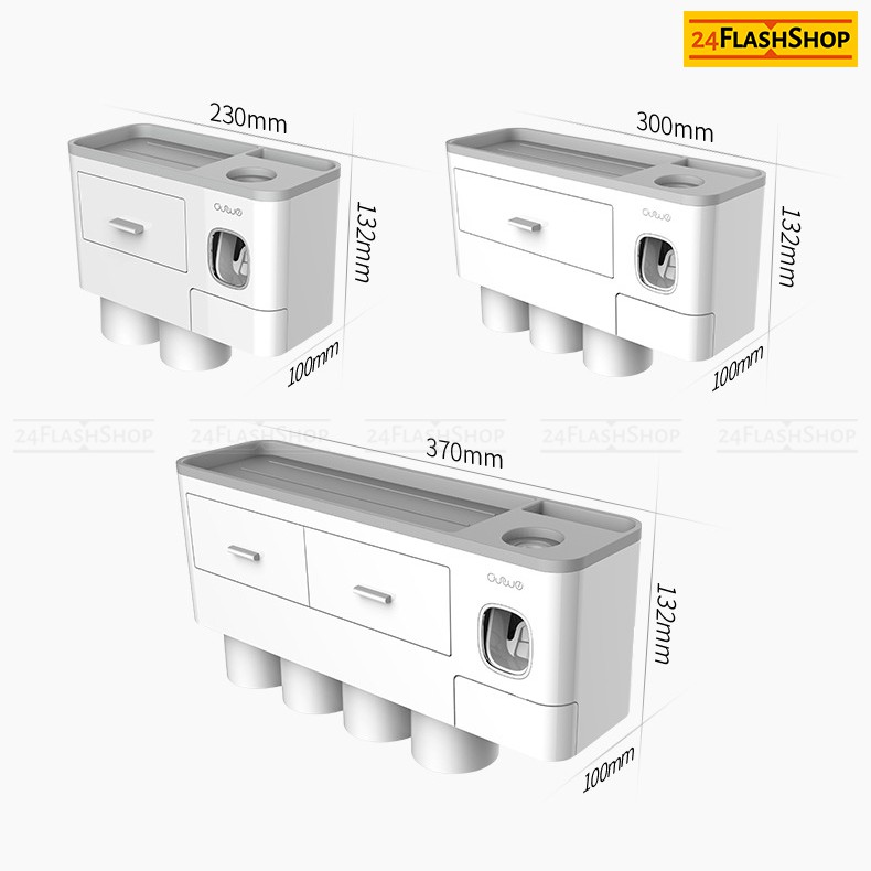 ที่บีบยาสีฟันอัตโนมัติ มีที่เก็บแปรงสีฟันพร้อมแก้วน้ำในตัว แบบติดผนัง ติดตั้งง่าย