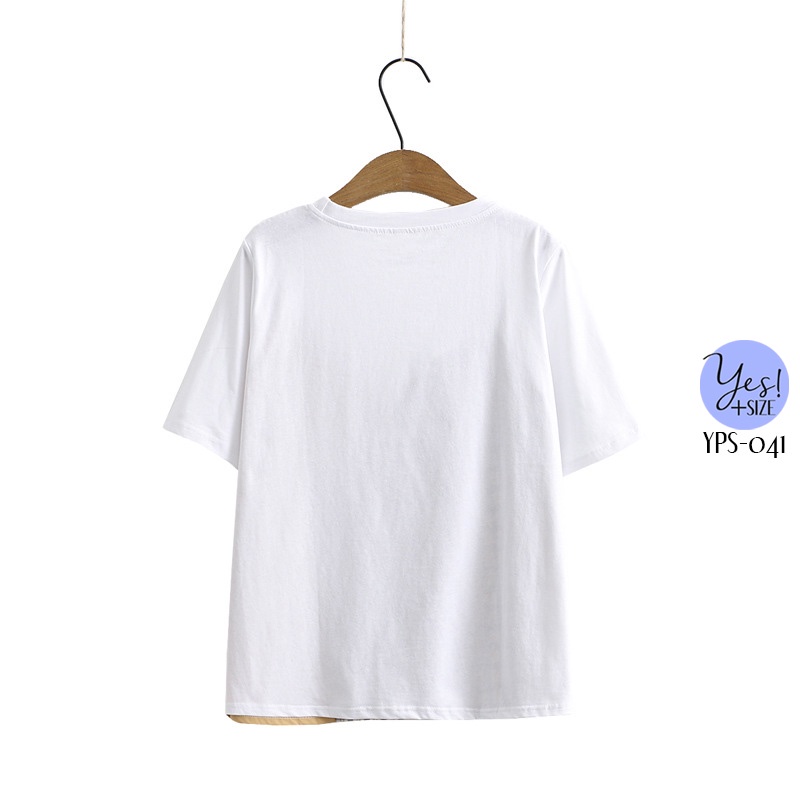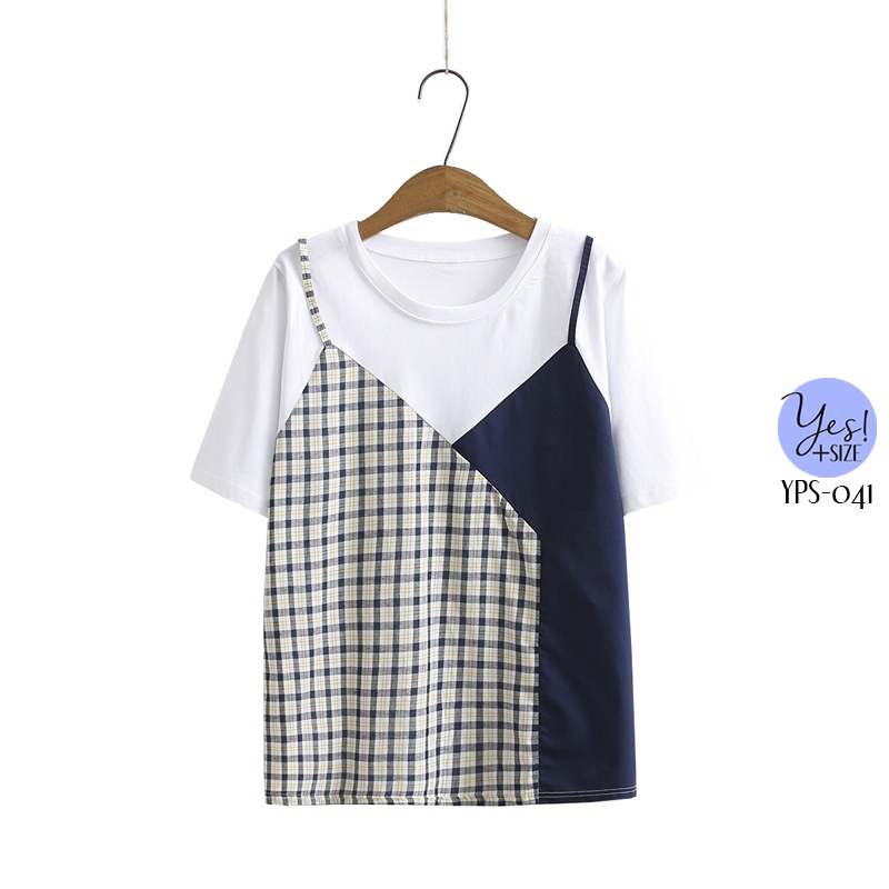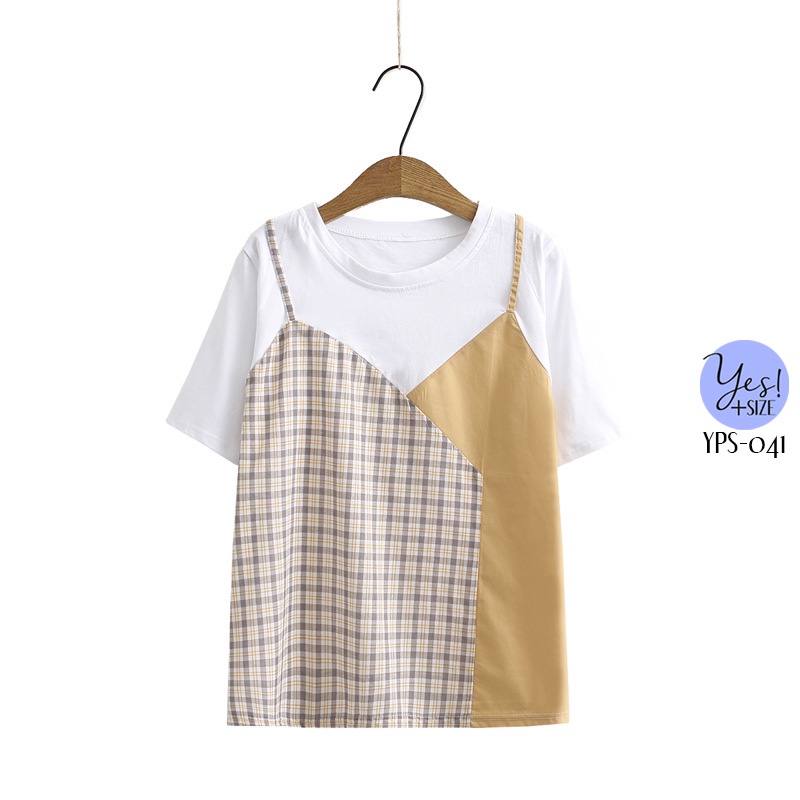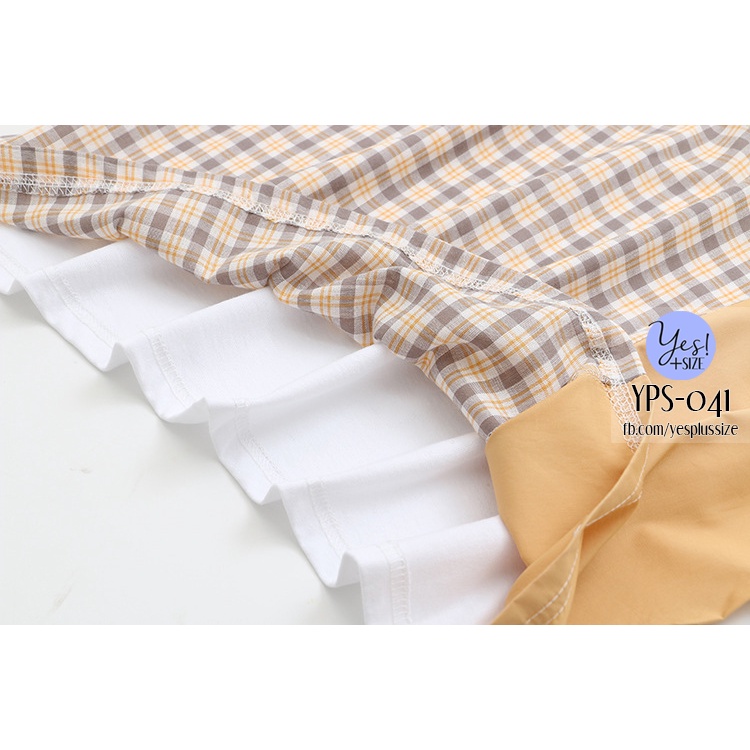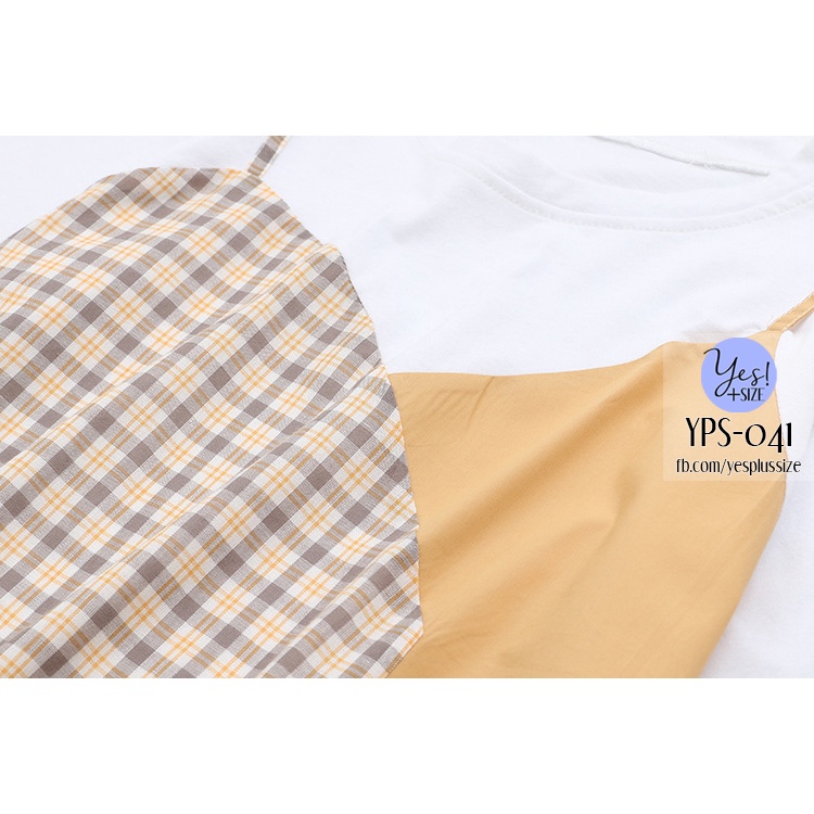 เสื้อยืดสีขาวสาวอวบ (XL-4XL) อกถึง 50 นิ้ว แต่งเอี๊ยมลายสก๊อตติดกับตัวเสื้อ สีเหลือง/สีกรม YPS-041