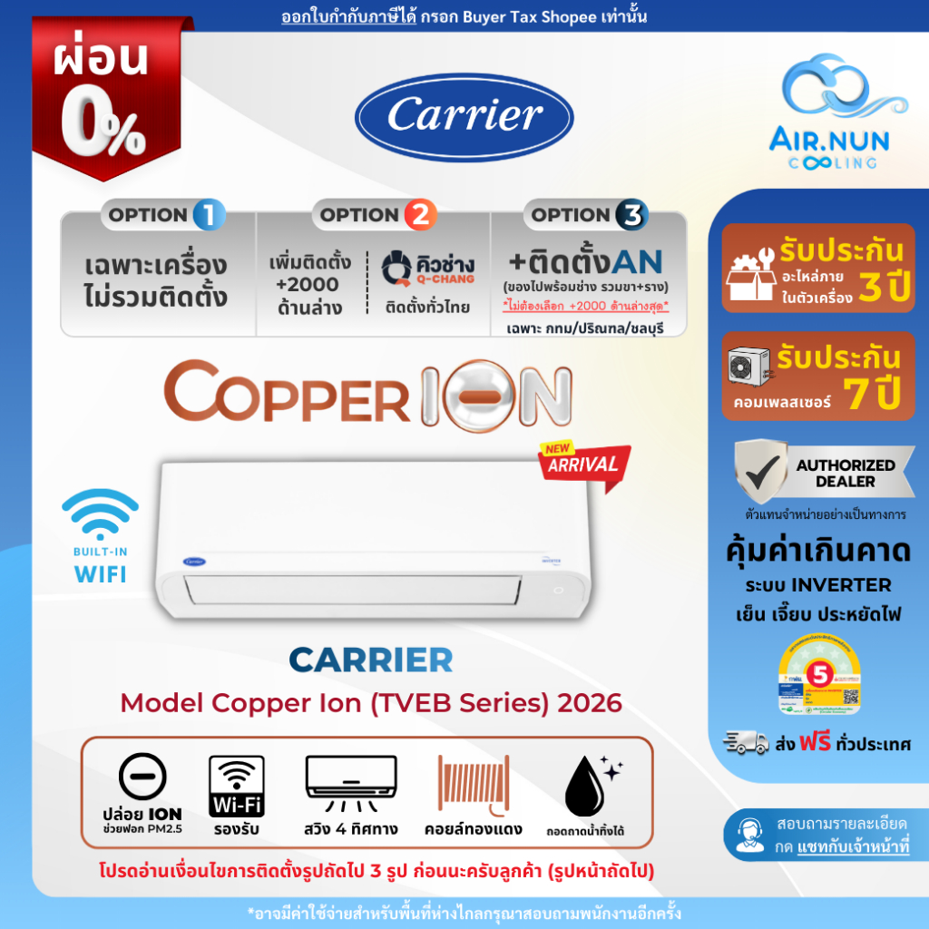 ส่งฟรี แอร์แคเรียร์ Copper Ion Wifi Inverter รุ่นใหม่ 2026 (TVEB Series) เบอร์ 5 ครบชุด+ท่อ รับประกัน 7ปี