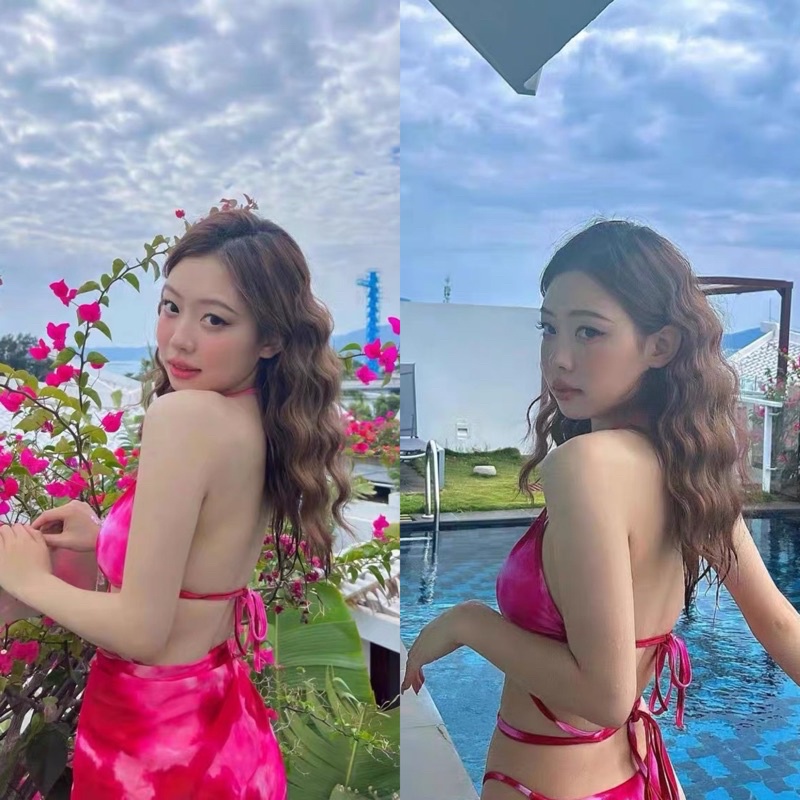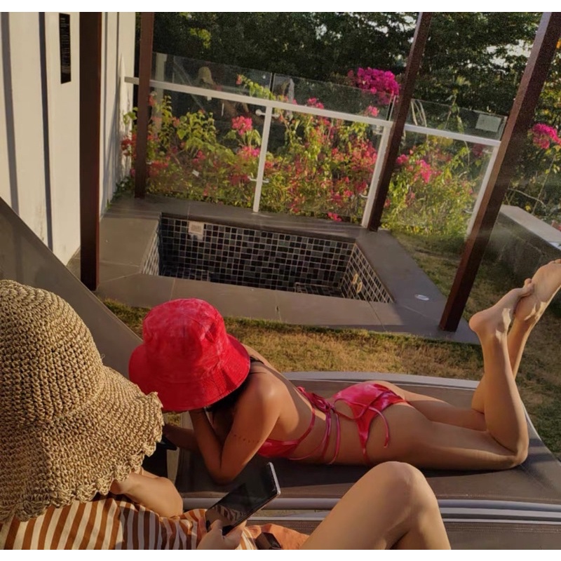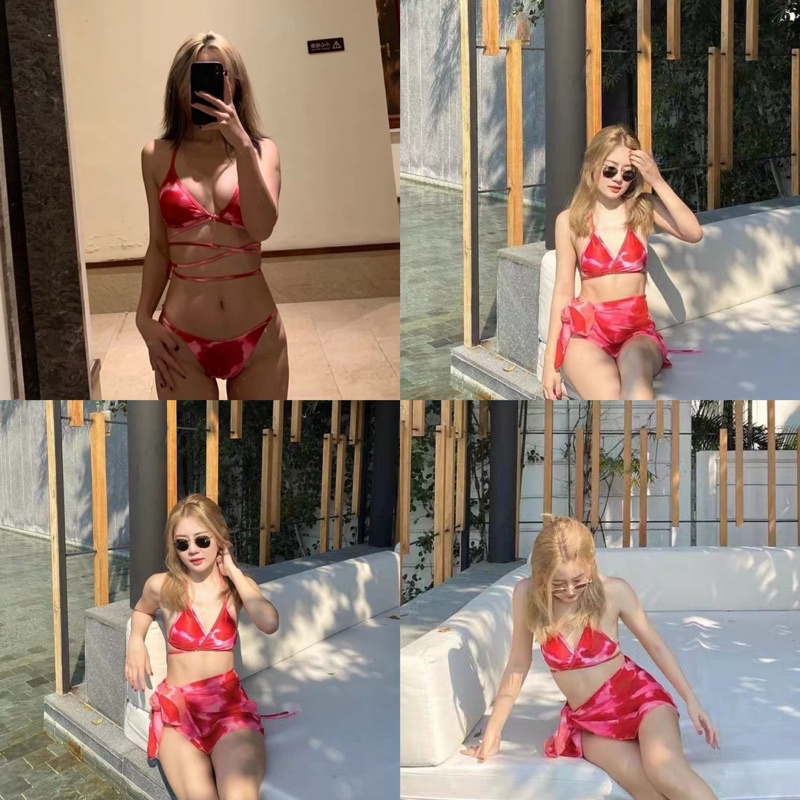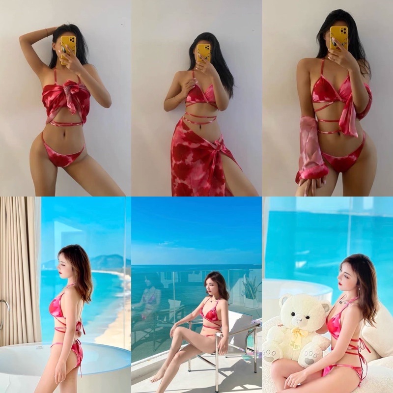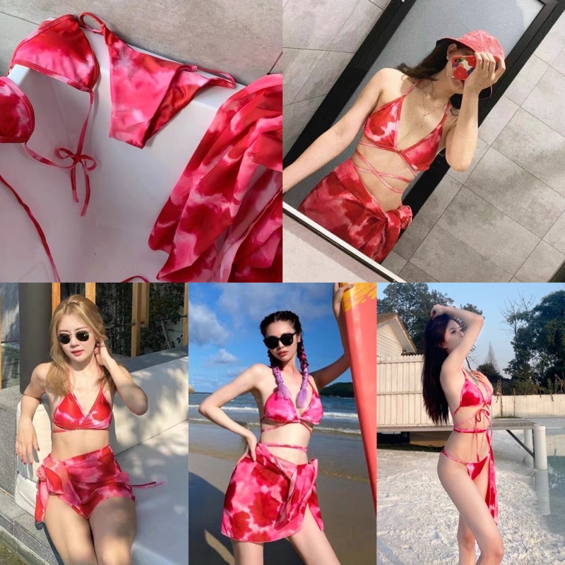 ชุดว่ายน้ำ บิกินี่ เซต3ชิ้นบิกินี่+ผ้าคลุม สีแดงสดใส