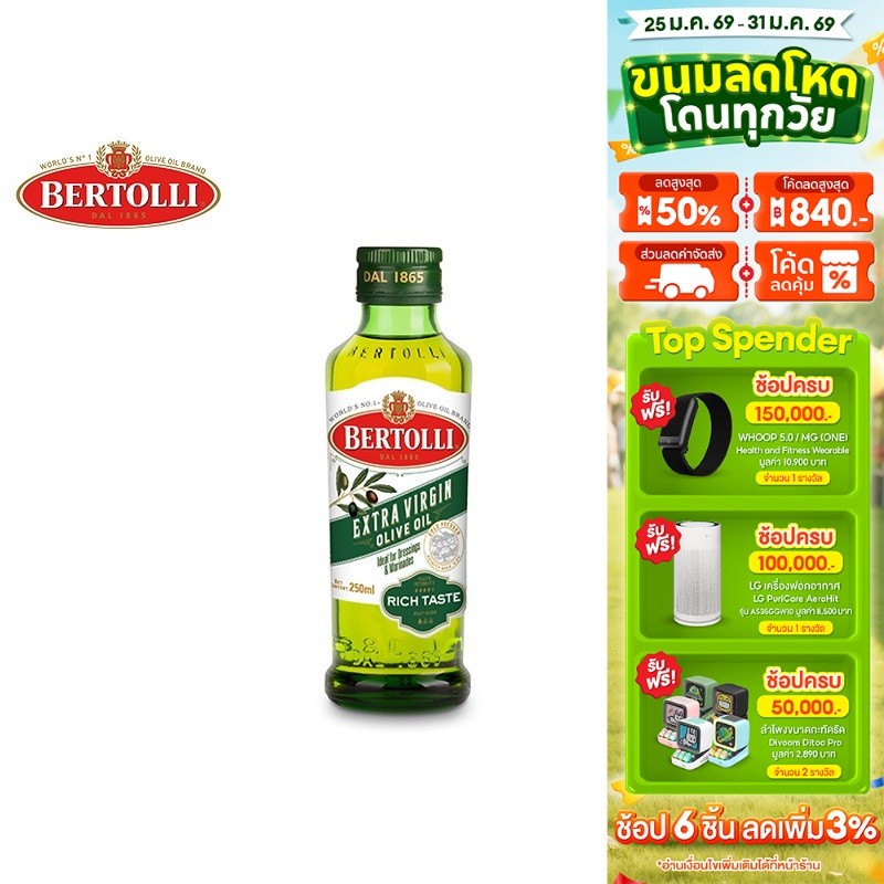 Bertolli Extra Virgin Olive Oil เบอร์ทอลลี่ เอ็กซ์ตร้า เวอร์จิ้น น้ำมันมะกอก (น้ำมันธรรมชาติ) 250 มล.