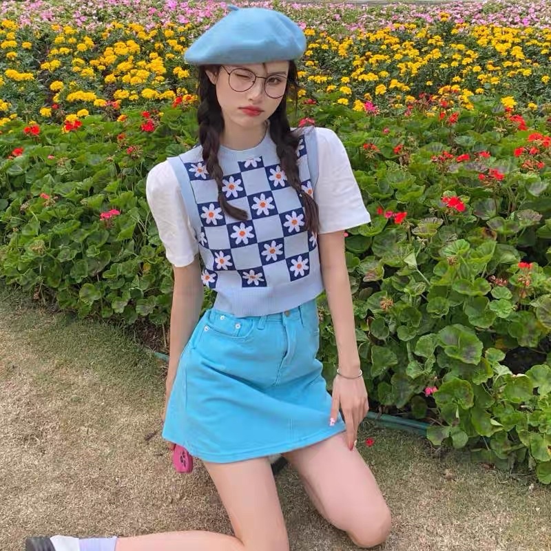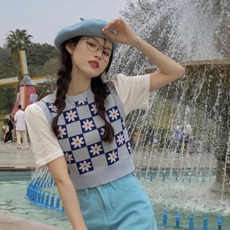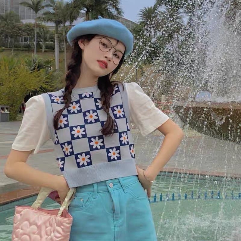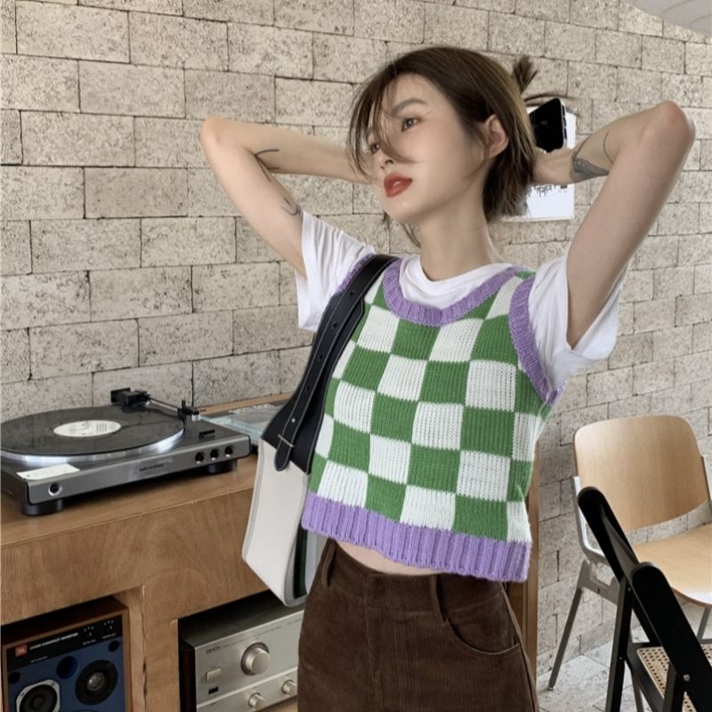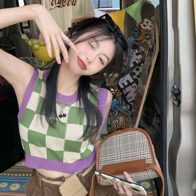 Bentoy(003/49102)เสื้อครอป เสื้อกั๊กไหมพรมแขนกุด ลายตารางสี - ทูโทน พลาดไม่ได้