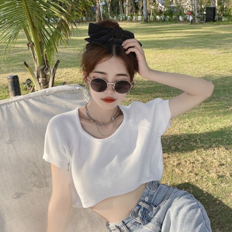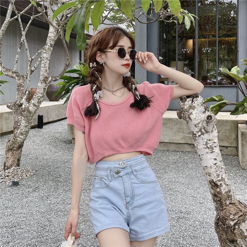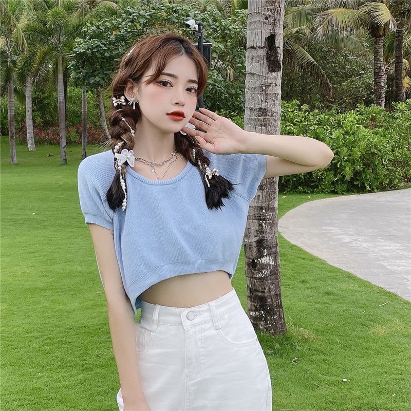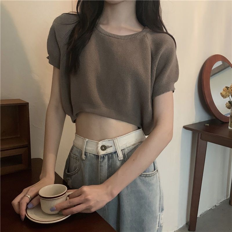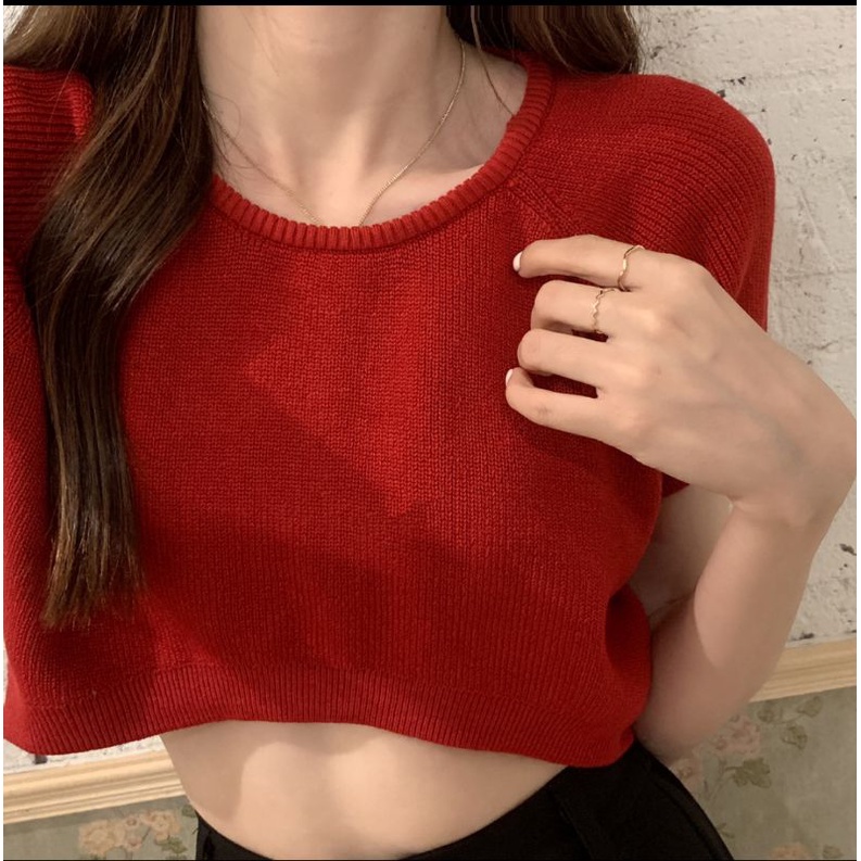 Bentoy(9572-1)เสื้อครอปแขนสั่น ไหมพรม คอกลม สีพื้นน่ารัก